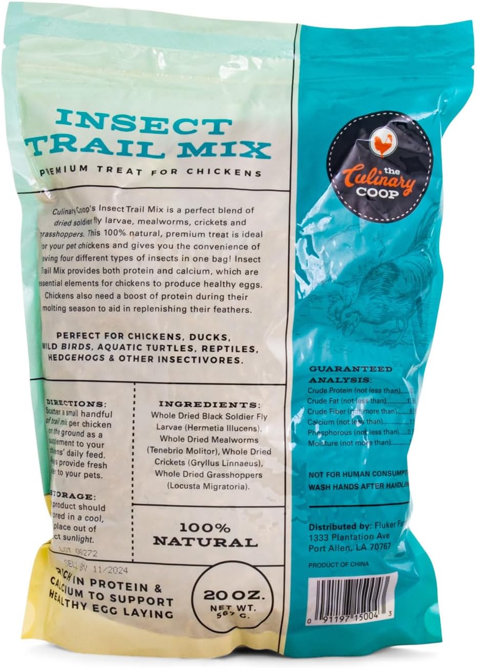 The Culinary Coop’s Insect Trail Mix is a perfect blend of dried soldier fly larvae, mealworms, crickets and grasshoppers. This 100% natural, premium treat is ideal for your pet chickens and gives you the convenience of having 4 different types of insects in 1 bag. Insect Trail Mix is rich in protein and calcium, which are essential elements for chickens to produce healthy eggs. Chickens also need a boost of protein during their molting season to aid in replenishing their feathers. Additionally, this mix is a great source of Omega-3s. Perfect for Chickens, Ducks, Wild Birds, Aquatic Turtles, Reptiles, Hedgehogs and other Insectivores in all life stages.
