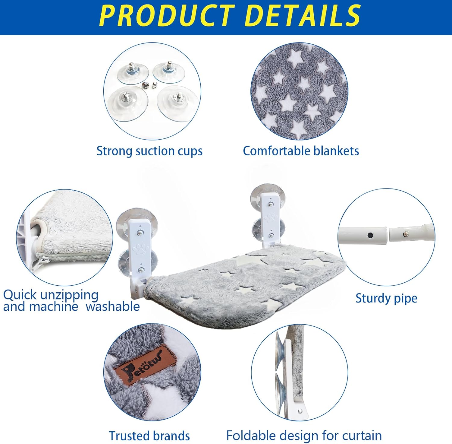 Strong Suction – Cup Attachment: Pettow Comfort cat hammock uses four 3.3 – inch – diameter suction cups for a secure, easy install on glass. With a fail – safe design, if one cup loses grip, the others keep the hammock firmly in place, giving you peace of mind for your cat’s safety.