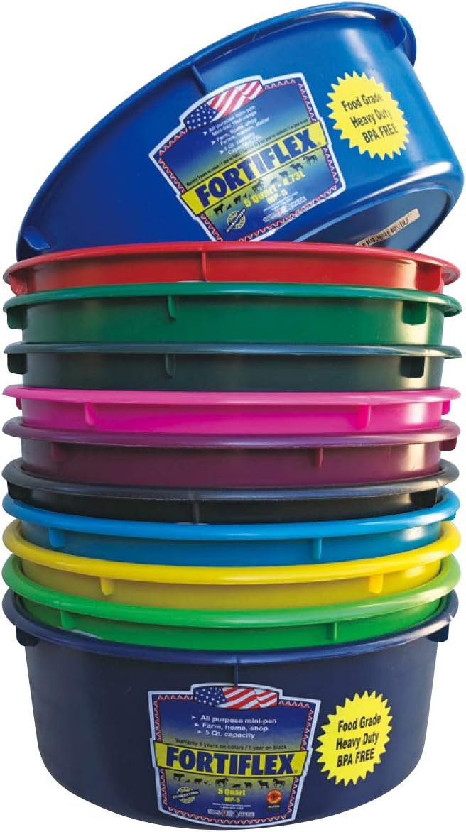 5-quart mini pan for feeding and watering. thick wall construction ensures lasting durability. us and metric markings shows water and feed consumption.