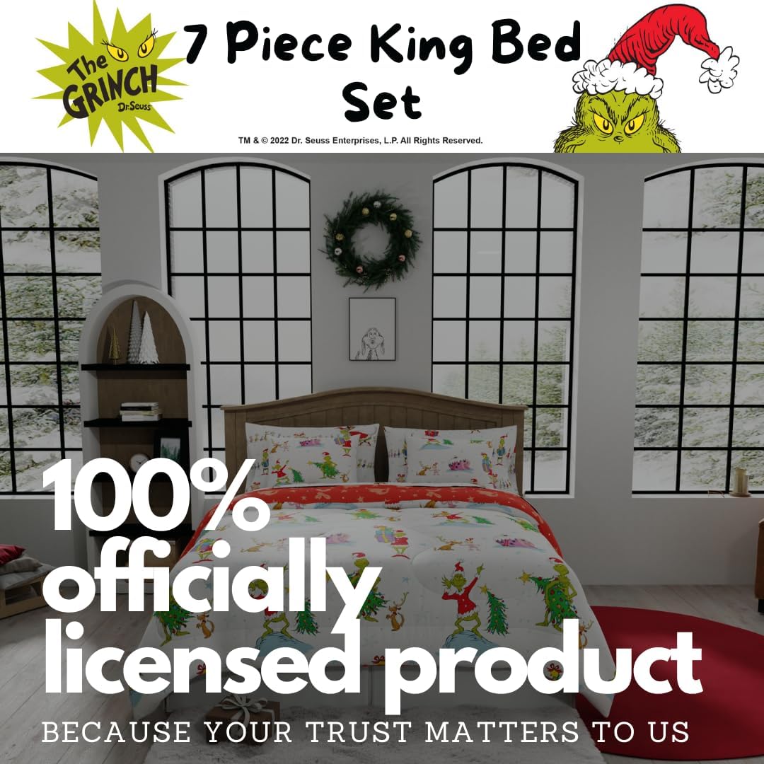 Franco Grinch by Dr. Seuss Holiday & Christmas Bedding Super Soft Comforter and Sheet Set with Sham, 7 Piece King Size (Official Dr. Seuss Product)