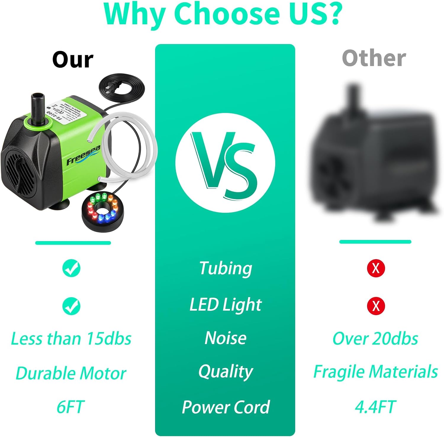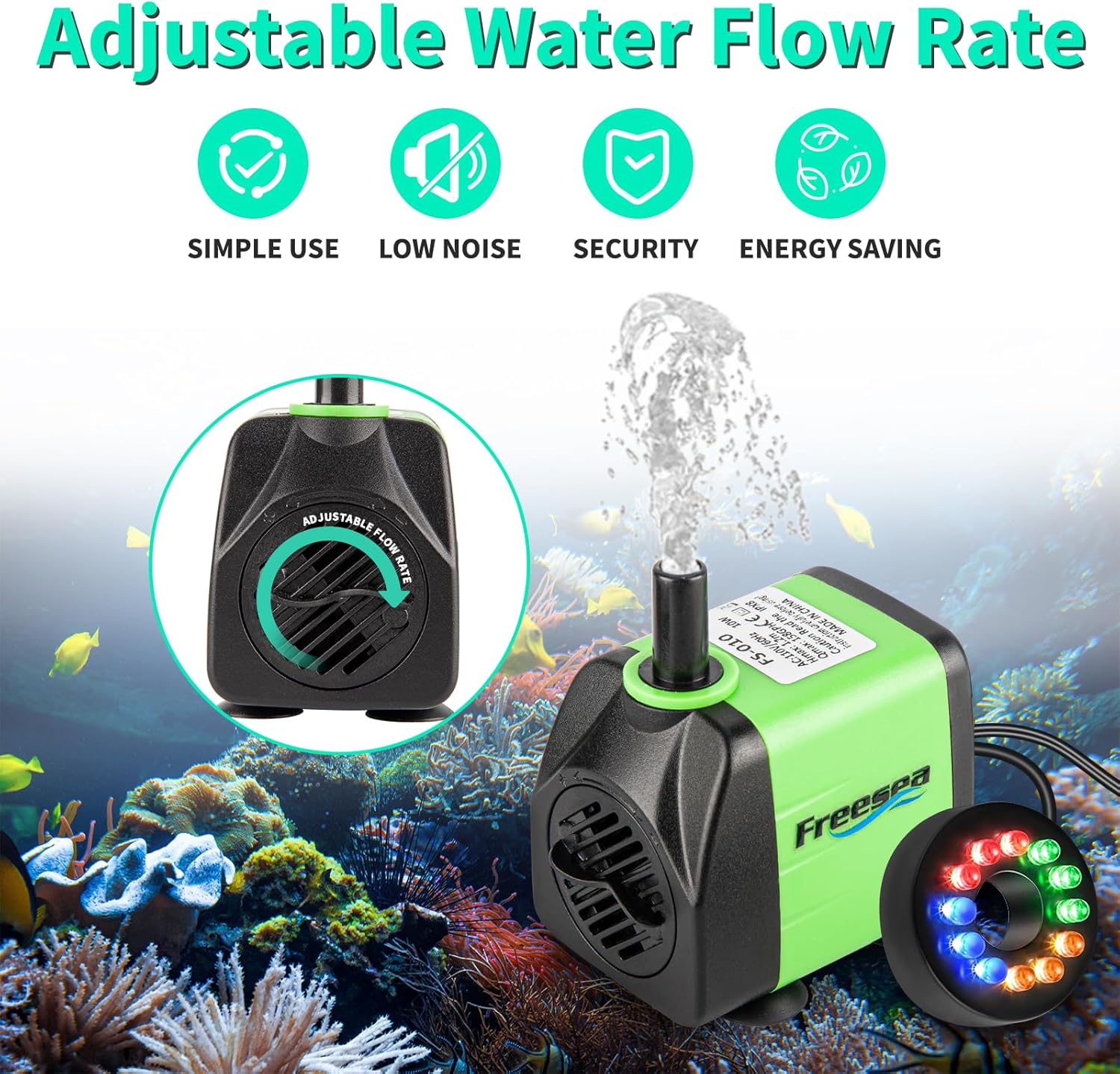 9 reviews for FREESEA Fountain Submersible Water Pump: 10Watt 160GPH Adjustable Aquarium Pump With LED Light 3.3ft Tubing for Outdoor Pond | Small Fish Tank | Waterfall