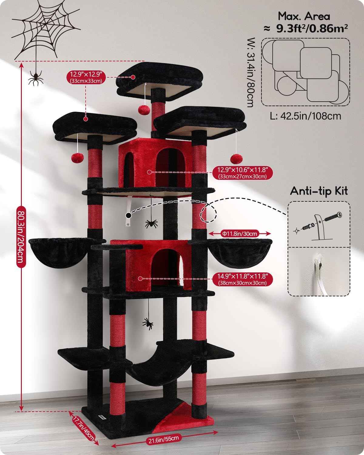 Goth Cat Tree: The 80-inch tall cat tree features a classic black and red color combination, creating a mysterious and elegant atmosphere. F80 spooky cat tree will bring a Halloween atmosphere to your home while providing endless fun for your cats