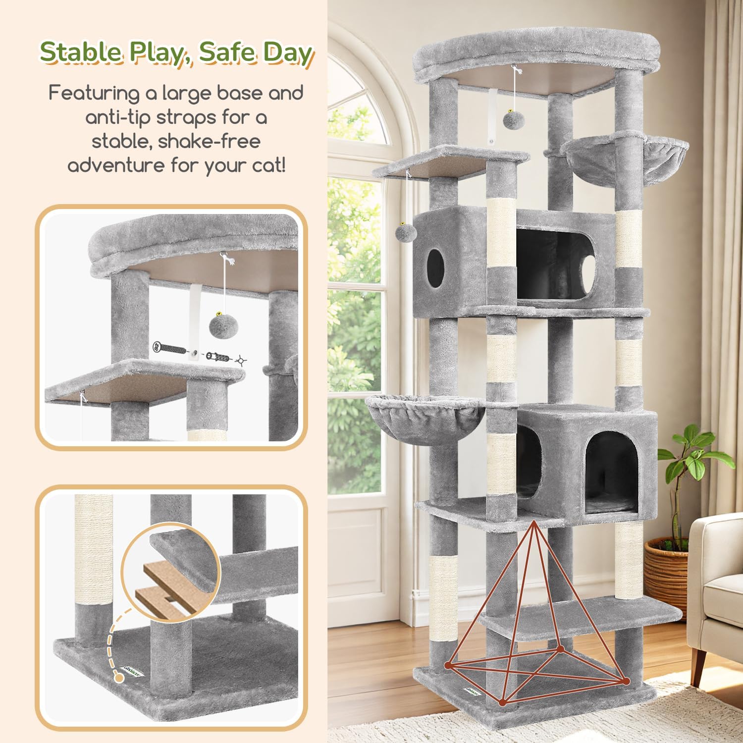 Globlazer Heavy Duty Cat Tree, 74in Sturdy Cat Tower for Large Cats Adult, Big Cat Tree with 7 Sisal Scratching Posts, 2 Padded Condos, 2 Dual-Ear Hanging Baskets, Enlarged Top Perch, S74, Light Grey