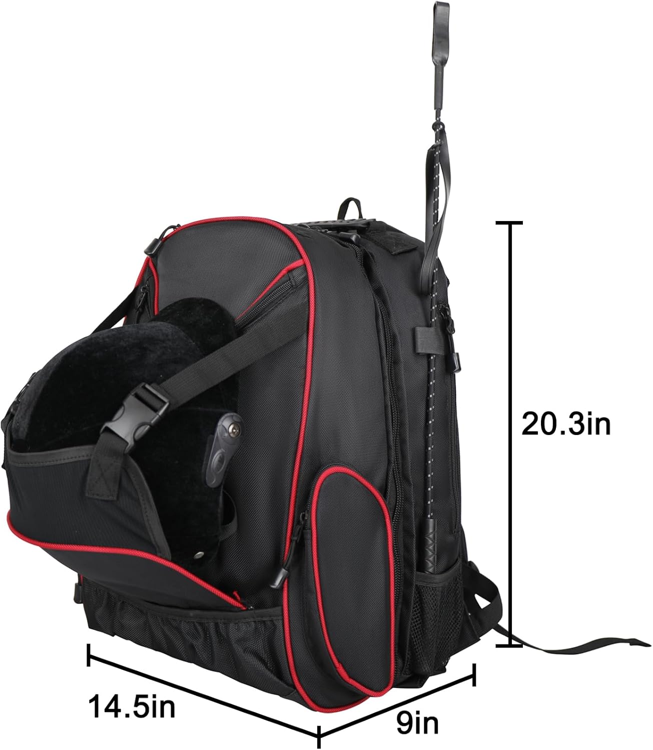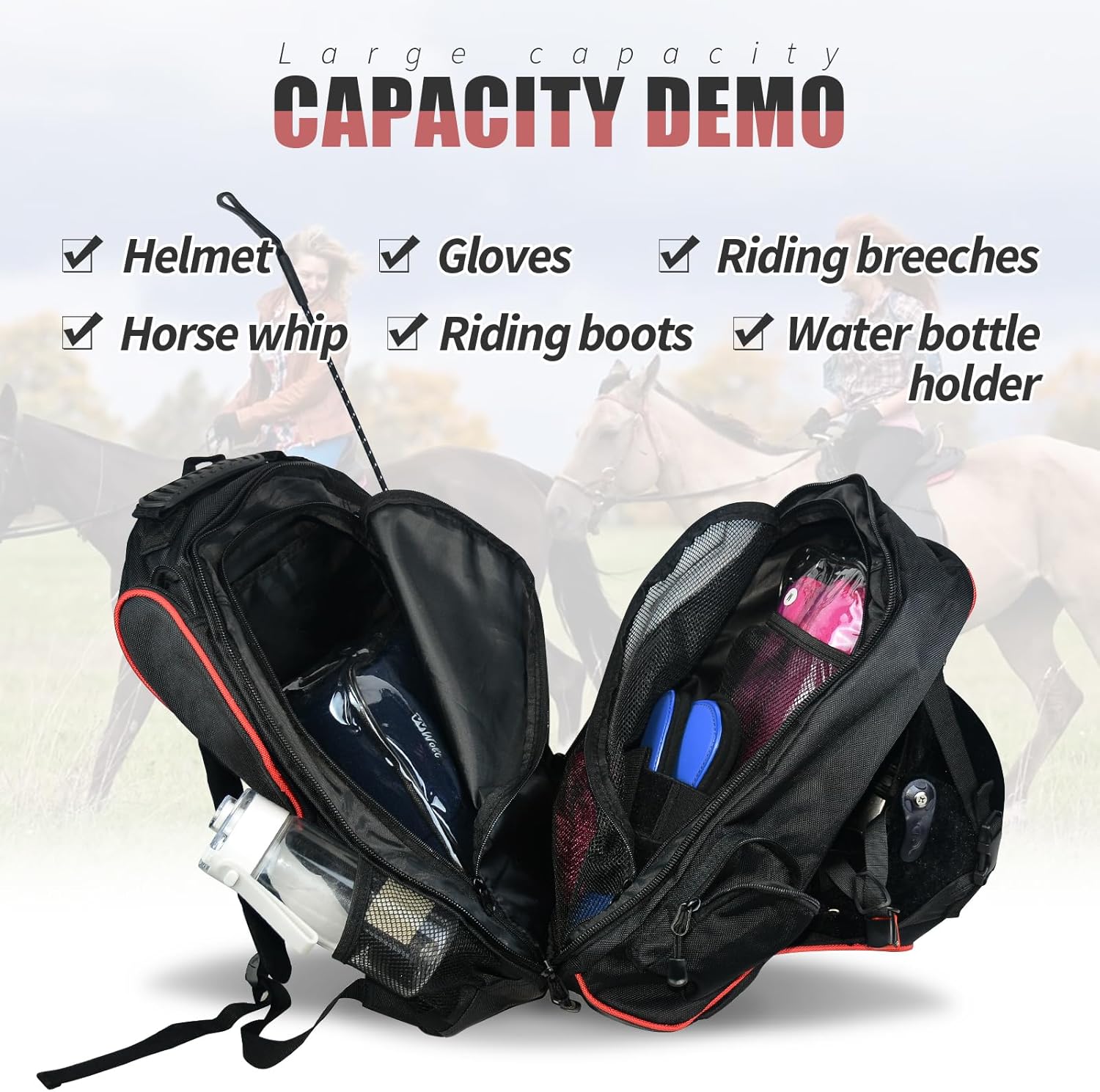 Large capacity: helmet backpack for all of your outdoor sports gear. Large bag size, 9 x 14.5 x 20.3 inches. Front pocket for helmet; middle main compartment, can be opened flat like a suitacase, easy to pack beings, sperated two main compartments with zipper cover. Exterior pockets, for horse whip, gloves, water bottle, keys, wallet, glasses, etc.
