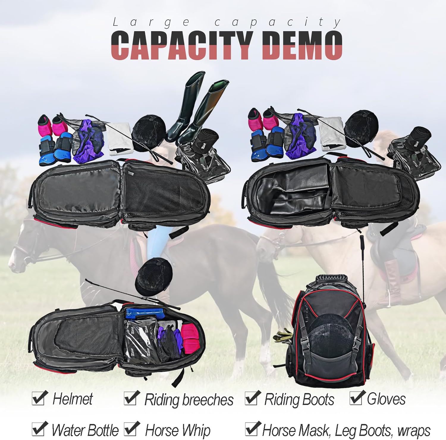 Multiple Application: The equestrain backpack with helmet holder can be used no only for horse riding gear, but also suit for motorcycle, bike riding, Hiking, travelling, casual use, etc.