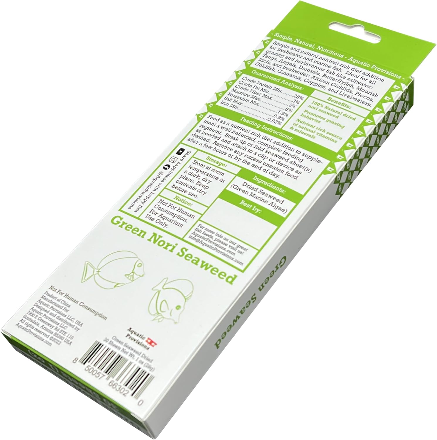 Simple and natural nutrient rich dried green seaweed sheets for freshwater and marine aquarium fish. This green marine algae offers an irresistible, fresh flavor that naturally attracts grazing, herbivorous, and omnivorous fish like saltwater: Tangs, Angels, Damsels, Butterflyfish, Moorish Idols, and freshwater: Cichlids, Plecos, Gouramis, Goldfish, Guppies, and Livebearers. Feed in addition to a well balanced, complete feeding regiment. Break up or fold seaweed sheet(s) as needed and attach to a clip or device as desired. Remove any excess uneaten food after a few hours or by the end of day.