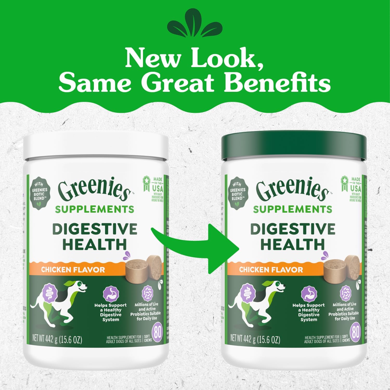 Greenies Supplements Digestive Health Probiotics for Dogs Chicken Flavor, 15.6 oz. Tub of 80 ct.