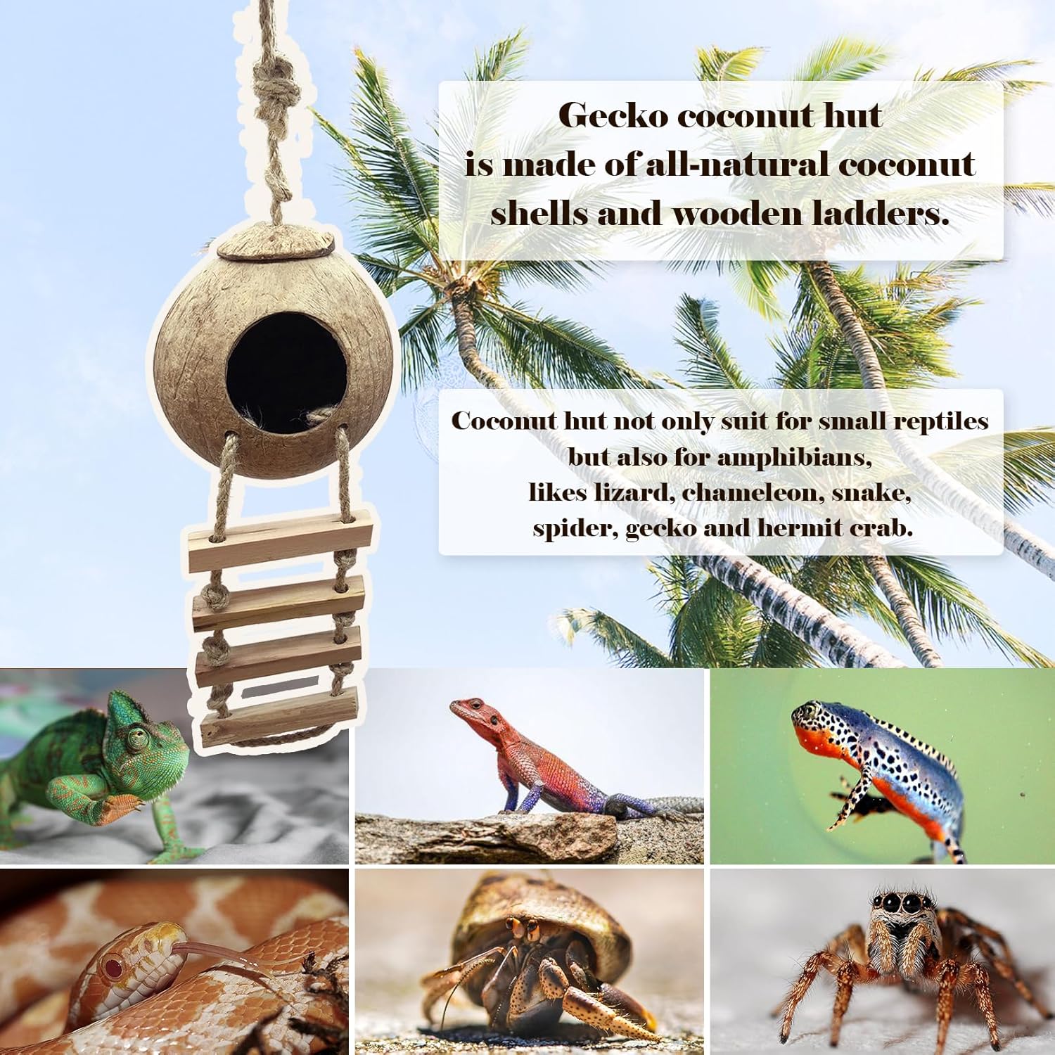 Safety Materials:House for geckos is made of natural coconut shells and wooden ladders, pure natural without pollution, safe for pets. This reptile hut toys encourages your pet to climb up and down for exercise to keep it healthy. Perfect for crested gecko tank accessories, it provides a attractive habitat