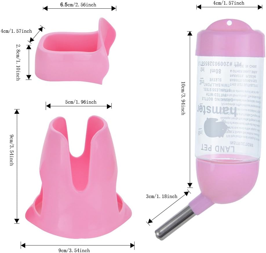 This hamster water bottle includes a water bottle, hideout base and a small food container, it is a little pet drinking hanging water bottle for hamster, dwarf hamster, gerbil, rabbits, guinea-pigs, chinchillas, rats, small mice and other little animals.