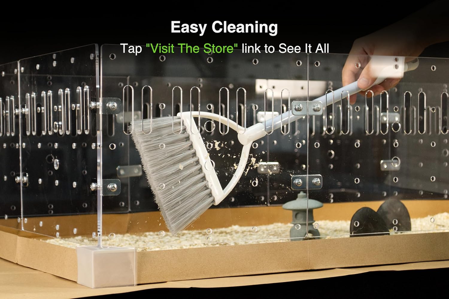 This is our PERFECTLY SIZED BROOM SET for sweeping around the cage. Don’t settle for small brushes. They are just too short, forcing you to squat down while sweeping. Additionally, since our cage is large, you need the length and reach to access all corners without having to walk around. This set is perfectly compatible with any GuineaLoft cage, and it has proven to be truly indispensable.