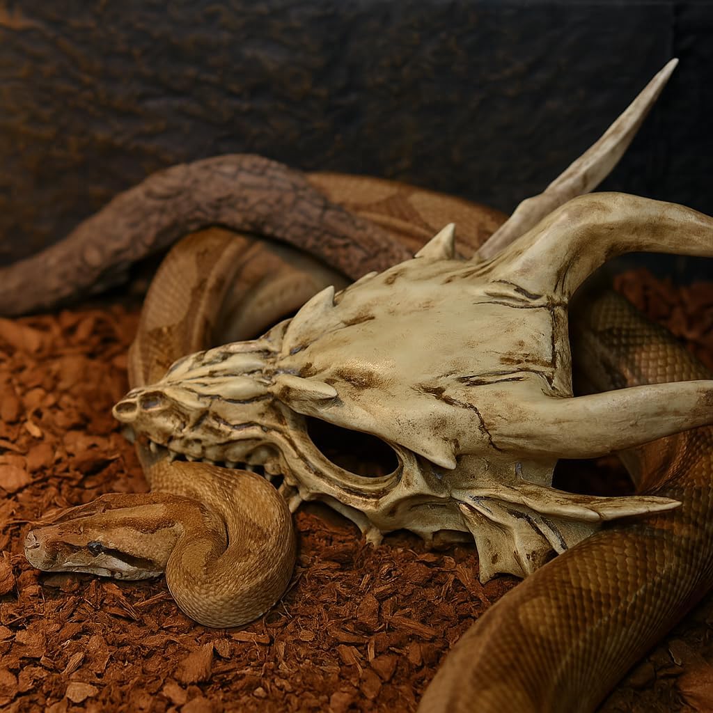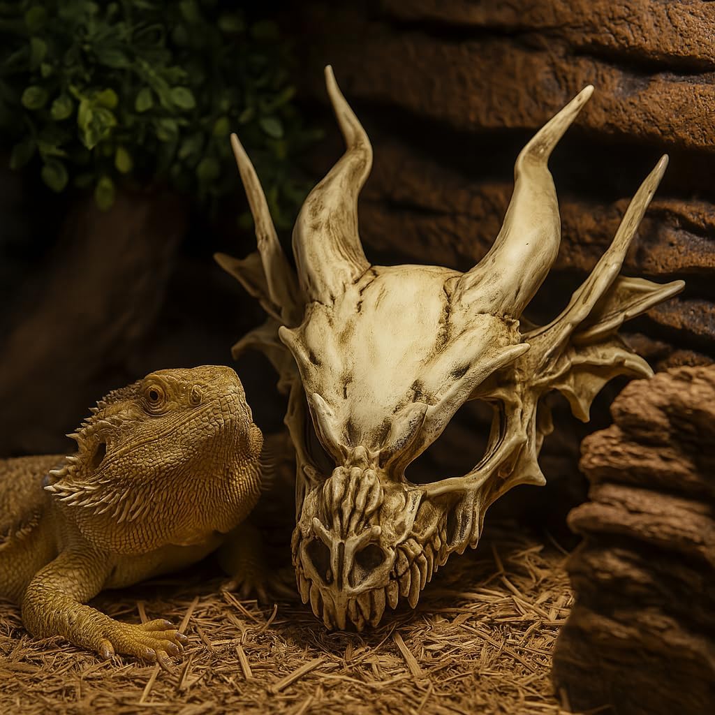 This dragon skull is a standout piece for any terrarium or reptile enclosure. Made from high-quality, durable resin, it feels solid and built to last, even in humid environments.The craftsmanship is impressive, with the realistic bone texture and gothic dragon skull design add a dramatic, eye-catching element to any setup. Itâs not just decorative either; it doubles as a perfect hideout for lizards, geckos, and bearded dragons.This would also be a great terrain piece for tabletop miniature games or model builders. A great blend of style and function!