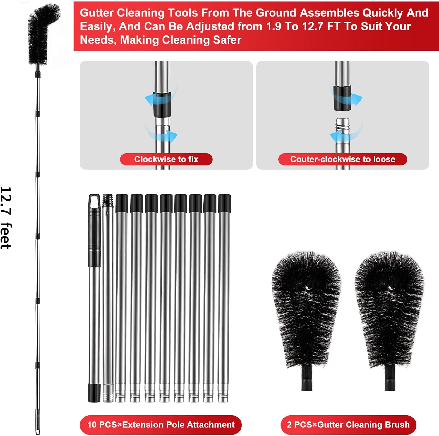 No Need To Climb Ladders—Safe And Reliable: Gutter Cleaning Tools from The Ground features an 10-section telescopic pole with 2 brush heads, adjustable in length from 1.9 to 12.7 feet, clean your gutters safely and efficiently without climbing a ladder, allows you to reach high gutters from the ground without worrying about safety issues, forget dangerous ladders