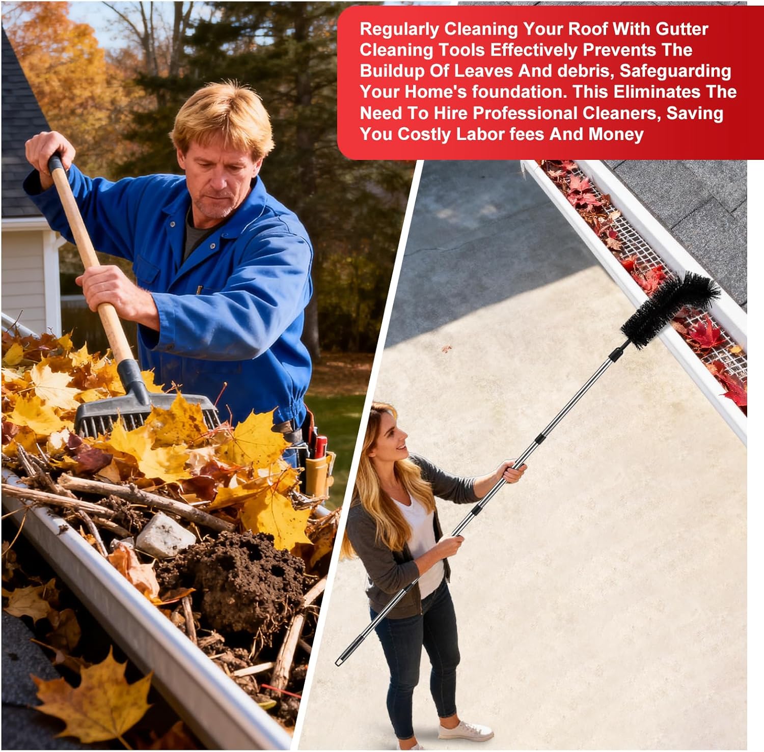 Prevent Clogging and Save Money: Regular use of a Gutter Cleaning Tools from the floor prevents debris buildup, protecting your home’s foundation, roof, and walls from water damage, Save time, money, and effort by avoiding costly repairs and professional cleaning services with this efficient and affordable gutter cleaning solution