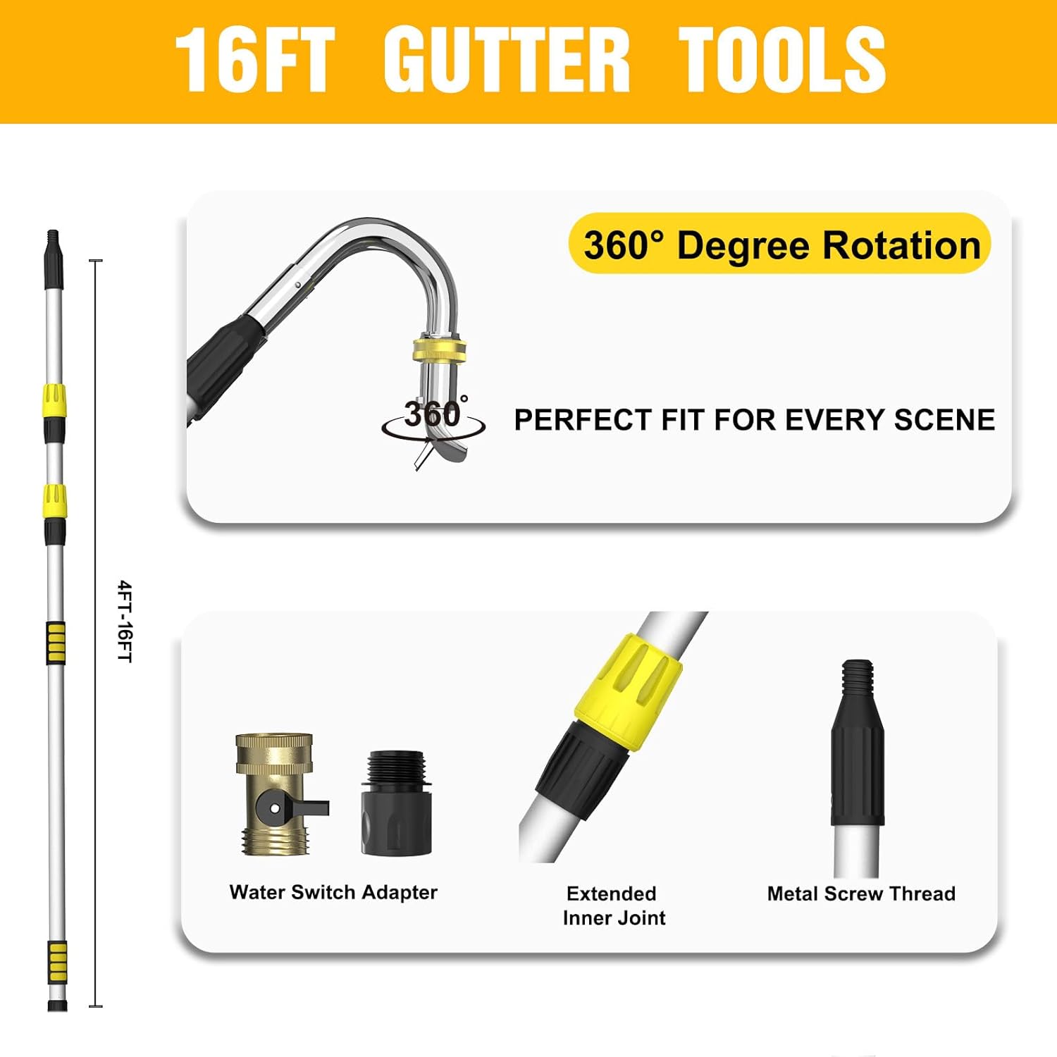Ultra-Long Telescoping Range for Easy High-Up Gutter Access: Our LAANPOLE gutter cleaning tools extends up to 16 feet, combined with your height, the gutter cleaning tool from ground effortlessly reaches and cleans most second-story or even higher gutters, eliminating the need to climb perilous ladders. Gutter cleaning tools from the ground make high-up cleaning simple and safe