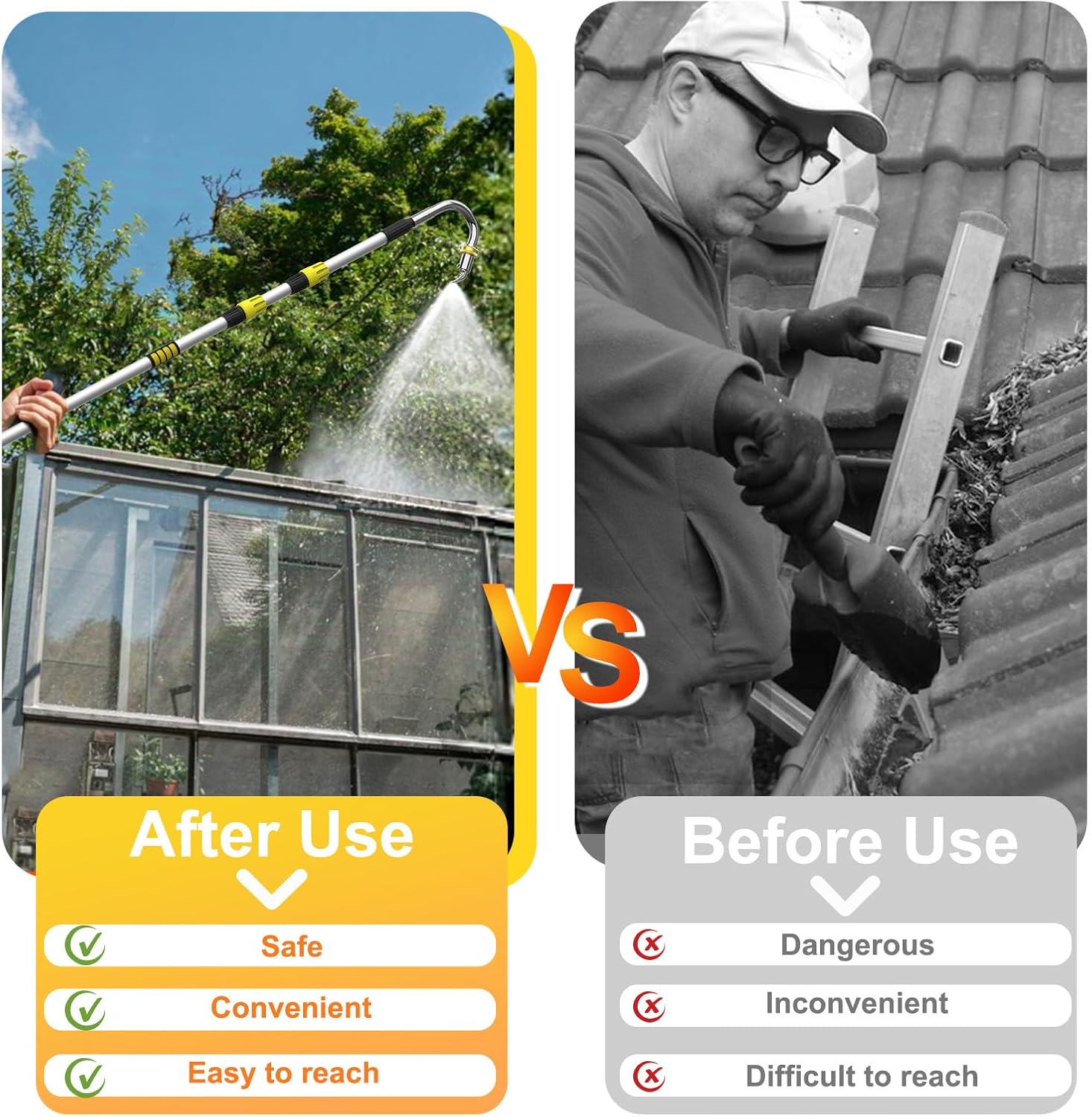 Adjustable Water Flow to Meet Various Cleaning Needs: This gutter cleaner tools from ground has a nozzle with a water flow adjustment feature, allowing you to effortlessly regulate the water strength by rotating the nozzle, with a variety of water flow modes, you can use this gutter cleaning tool for anything from a gentle rinse to a powerful clean, while reducing water wastage. This function of the rain gutter cleaning tool makes cleaning more efficient