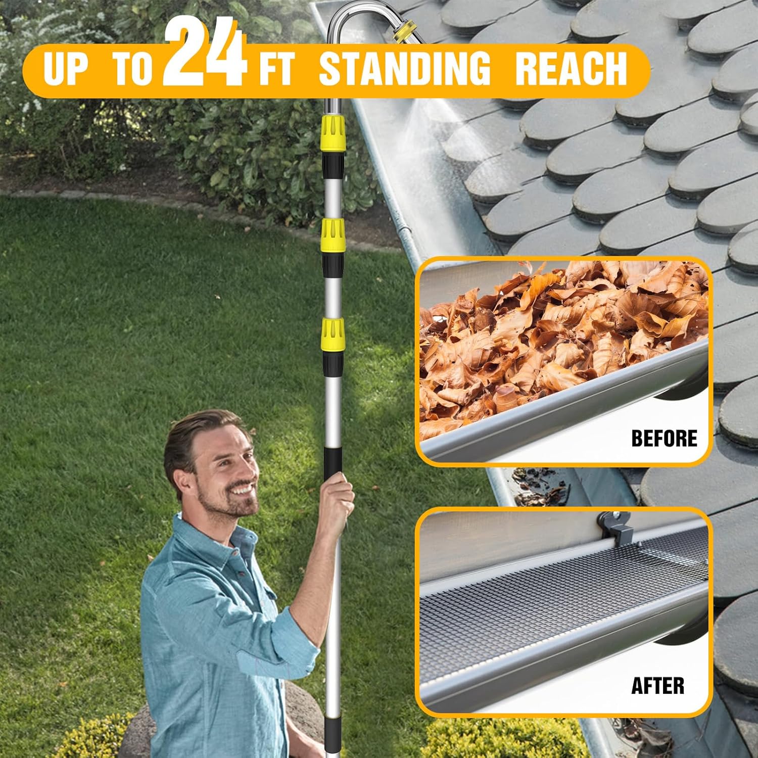 Gutter Cleaning Tools from The Ground, 24FT Reach Rain Cleaner with Bendable Wand and Quick Connect Adapter for Garden Hose