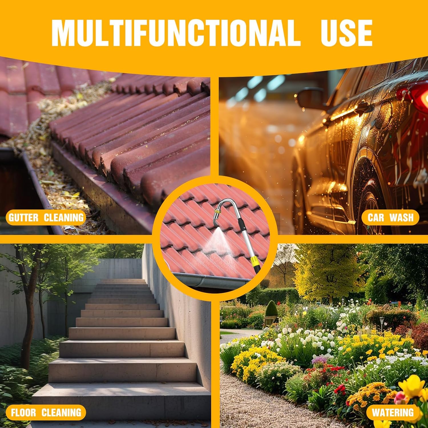 Flexible Spray Nozzle for All Angles : Equipped with a bendable nozzle design, This gutter leaf cleaning tool can easily access hard-to-reach corners of gutters, ensuring a thorough cleaning. Whether the gutters are straight or curved, it adapts flexibly to any angle, making it an ideal gutter cleaner