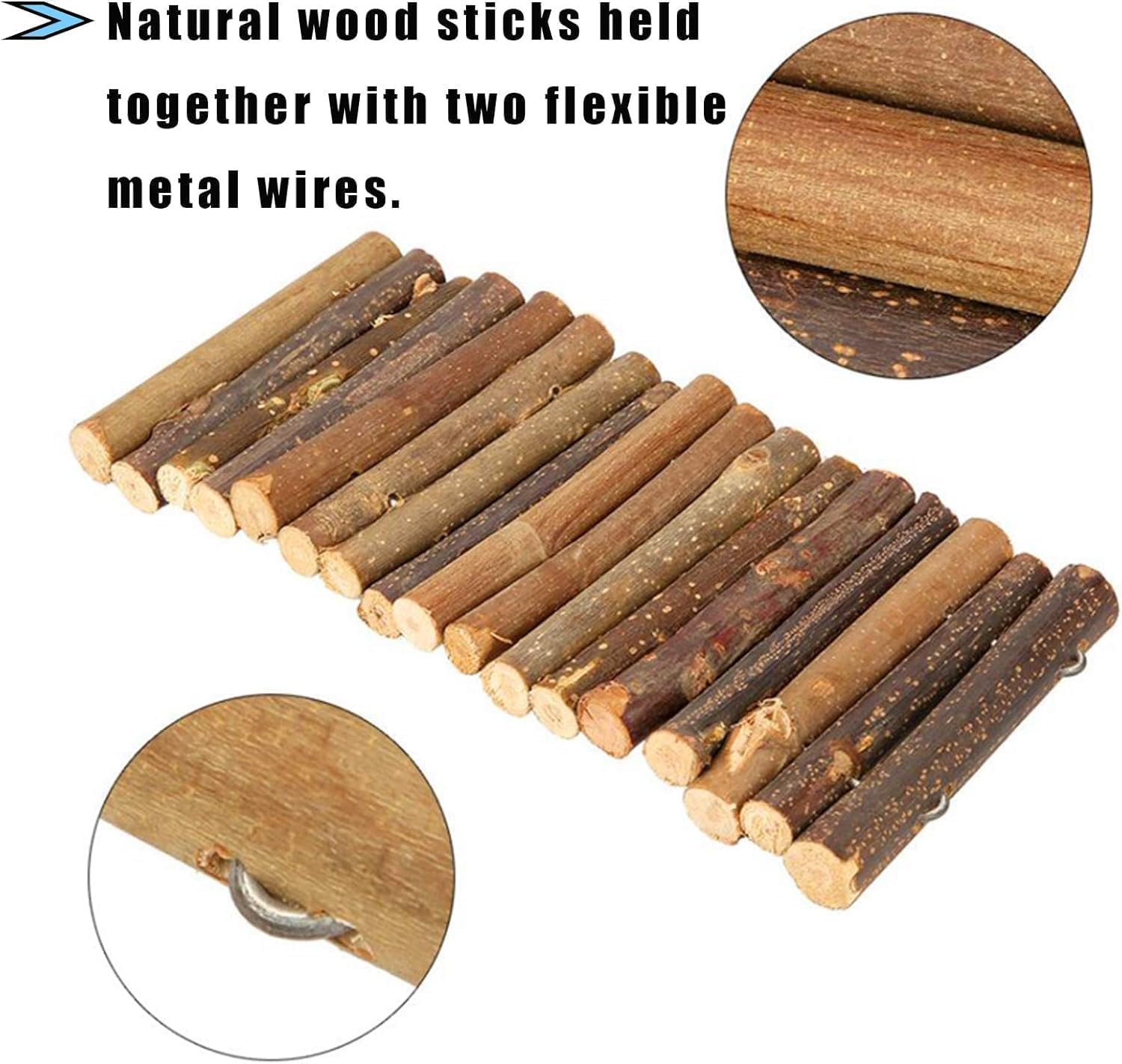 Edit* (The only issue I had was the silver paint on the end hooks. I scraped it right off no problem. I’ve had these for a lil while now and they are good. Very sturdy. Even with bending them multiple times no signs of wearing down . None of my hamsters seem interested in chewing them. Only a few times when it was new to them. I didn’t have the mold issue like some have mentioned and like mentioned in description. But regardless it is always a good idea to sanitize everything you buy for your pets and yourself. I will be buying more of these. If the seller reads this and if it is in their control I advise you to not paint the end hooks. There is no need to paint silver hooks silver. )I bought these to use in my hamster cages. They arrived earlier then expected which was great. Upon inspection the end pieces that I should be able to hook to the cage or tie something to are so deeply impressed into the wood that nothing can hook into them. I can dig the wood out around them so not a huge problem for me. What concerns me is the end hooks are painted with something silver that is chipping off right out of the package. Unnecessary paint. I will not put them in the cage until I get it all off. With that said they feel very strudy and the logs are thick which I like. Not sure I will buy these ones again though due to that silver paint.
