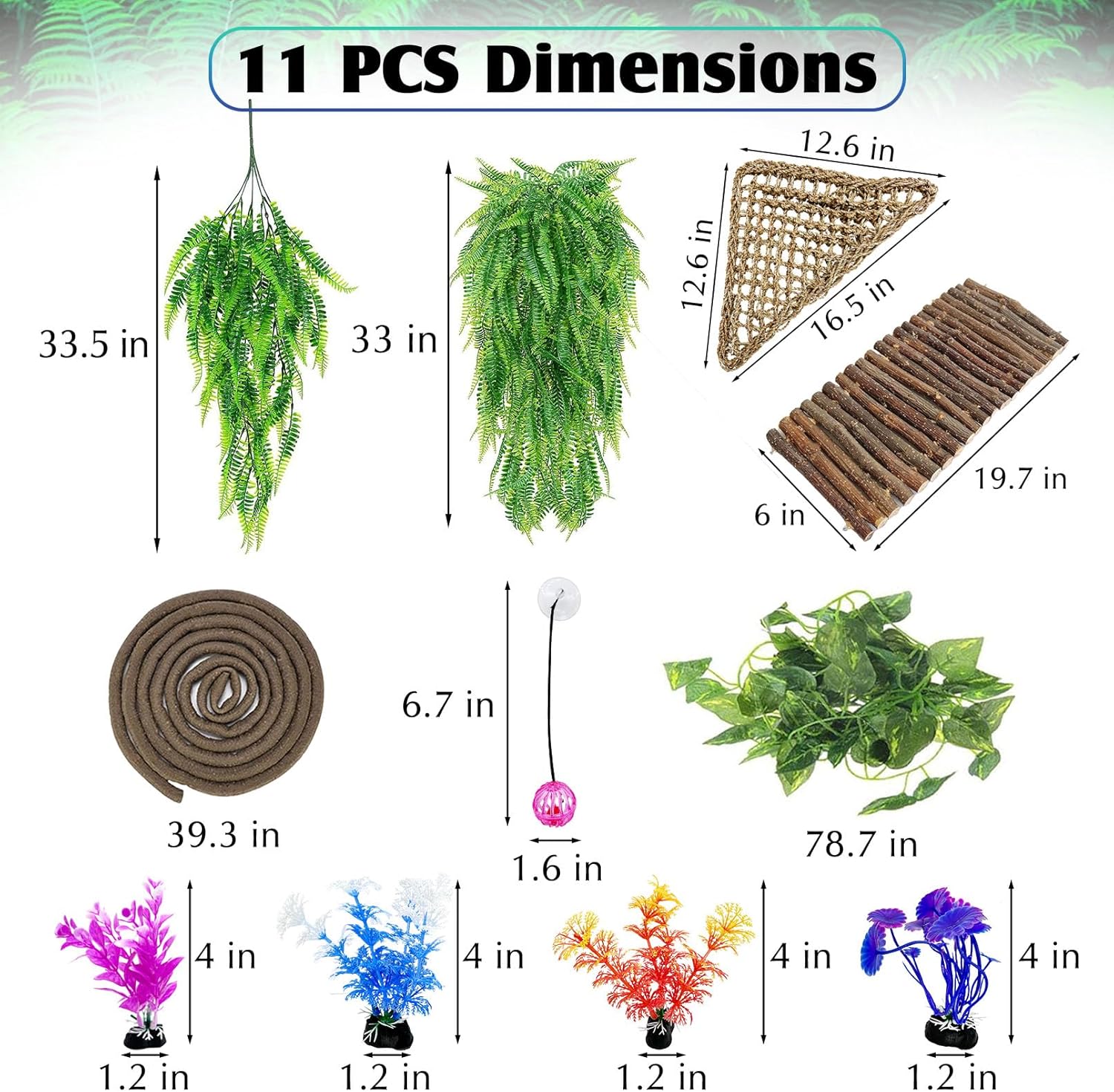 PACKAGE INCLUDE : 1× Triangle Seagrass Bearded Dragon Hammock ,1× Bendable Vine branch, 1× Flexible Bendable Reptile Plant Leave ,2× Hanging Plants ,4× mini Reptile Artificial Plants, 1× Bearded Dragon Toys Ball bell, 1× Bendable Bridge, 3× Suction cups and hemp rope. Reptile hammock is perfect for arboreal reptiles and amphibians. Bearded Dragon Tank Accessories are suitable for bearded dragons, lizards, chameleons, tree frogs, geckos, turtles, tortoises, snakes and other reptiles