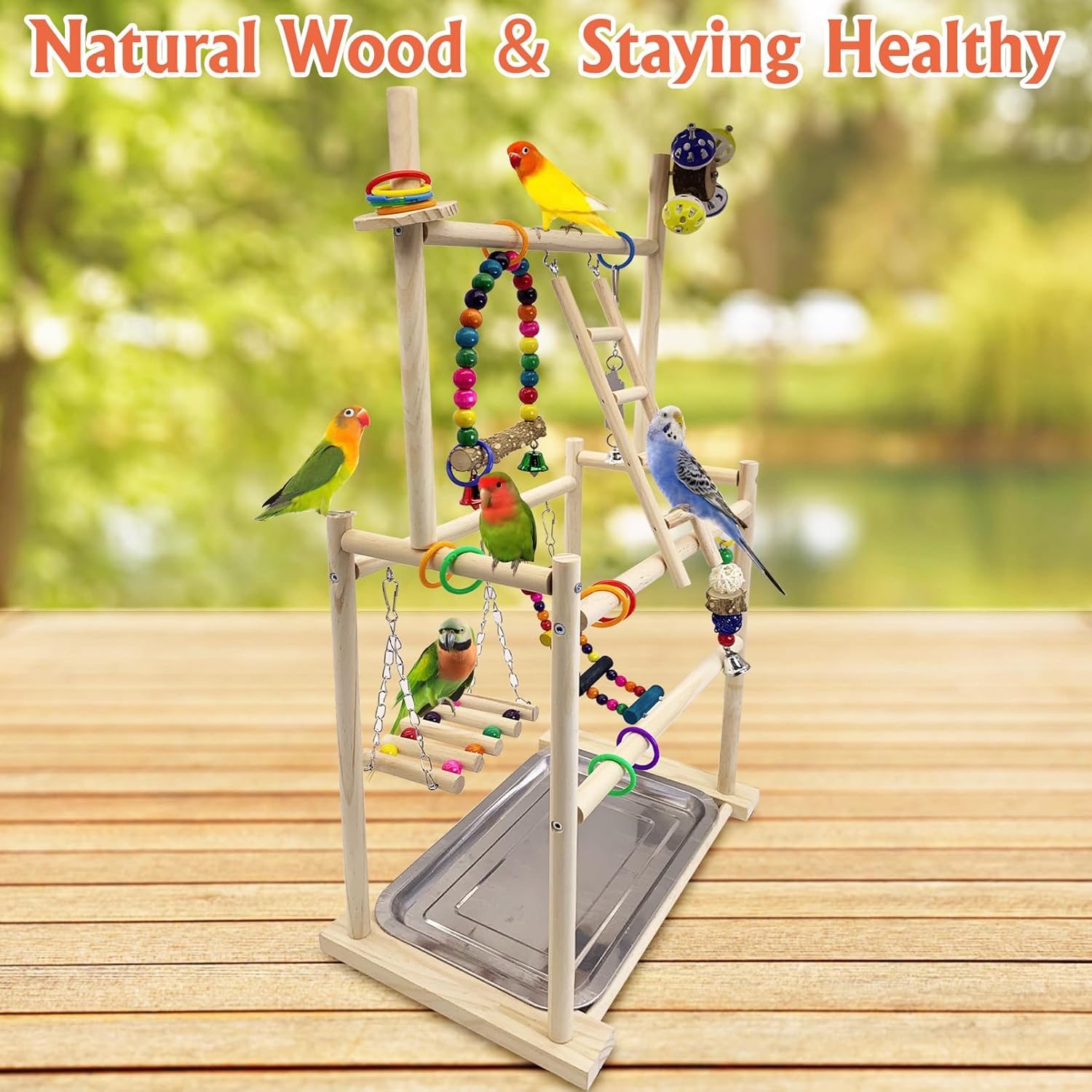 Safe & Natural Wood Construction: Crafted from bird-safe natural wood, our parrot playground prioritizes pet health. Smooth edges ensure cockatiels/budgies enjoy chewing and perching safely for years