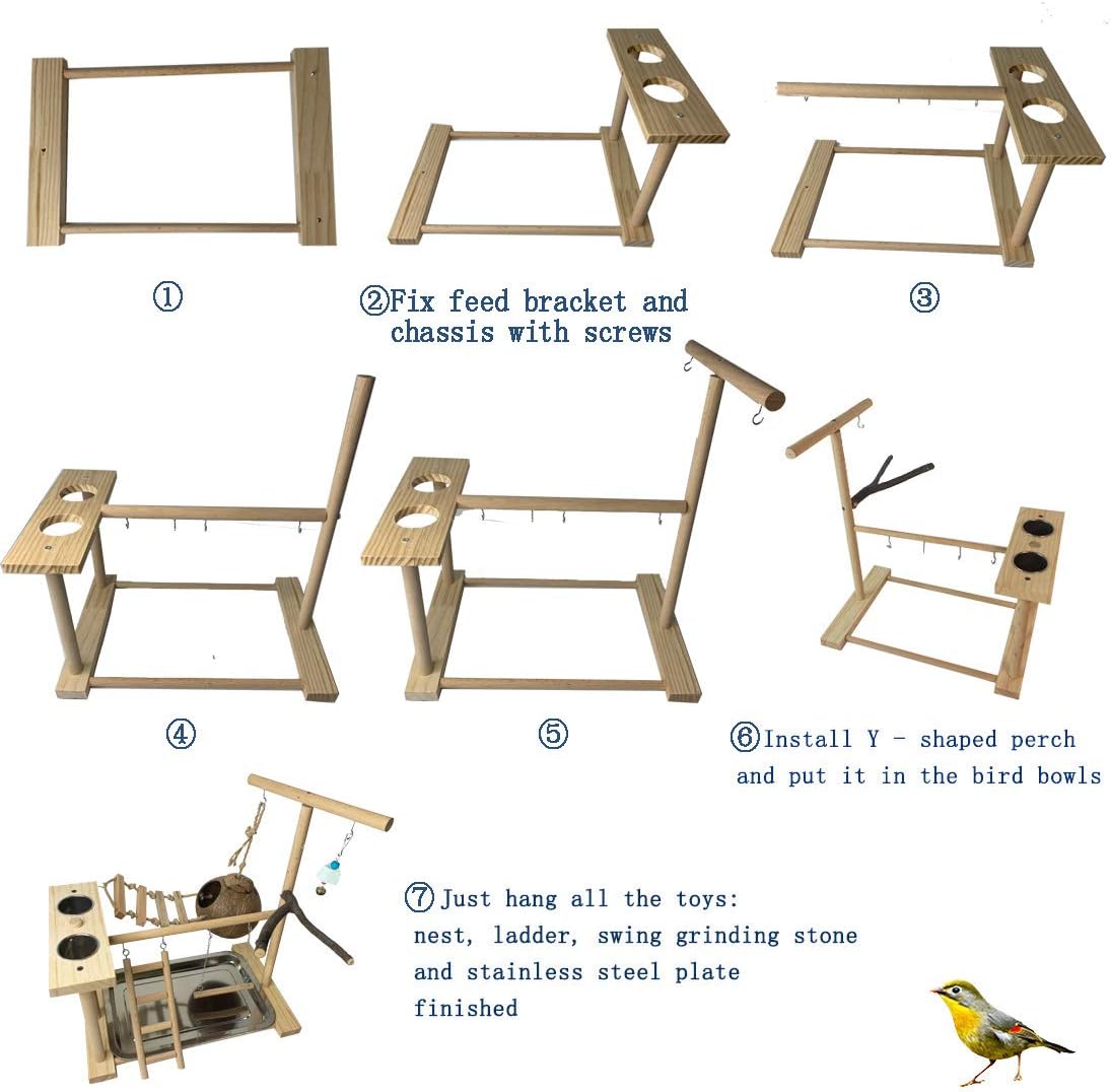 NATURAL WOOD / STURDY / HIGH QUALITY : The parrot playstand is made of natural wood material,firm and environmental protection,safety to chew.The parakeet playground perch surface polished smooth,will not hurt the bird feet. and all the parts are connected with screws ,not glue.This way,the bird play gym is more sturdy and more stable