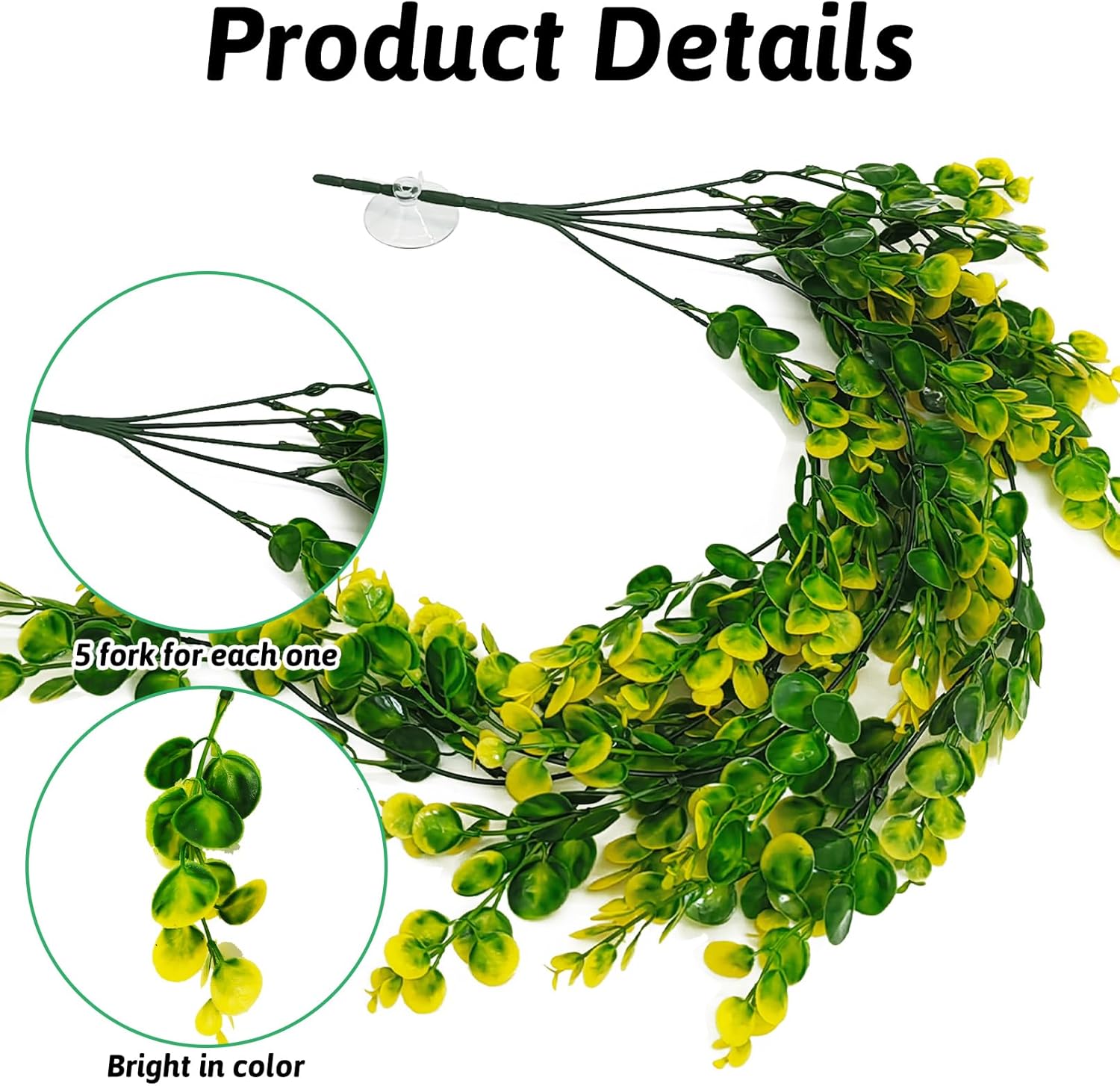 Package Including: The package contains 2 plants vines 29.9 inches each and come with 4 pieces suction cups. Plants is made with polyethylene plastic and soft silk leaves, clear texture and bright color, durable. Creates a fun & dynamic hiding spot and climbing for reptile amphibians