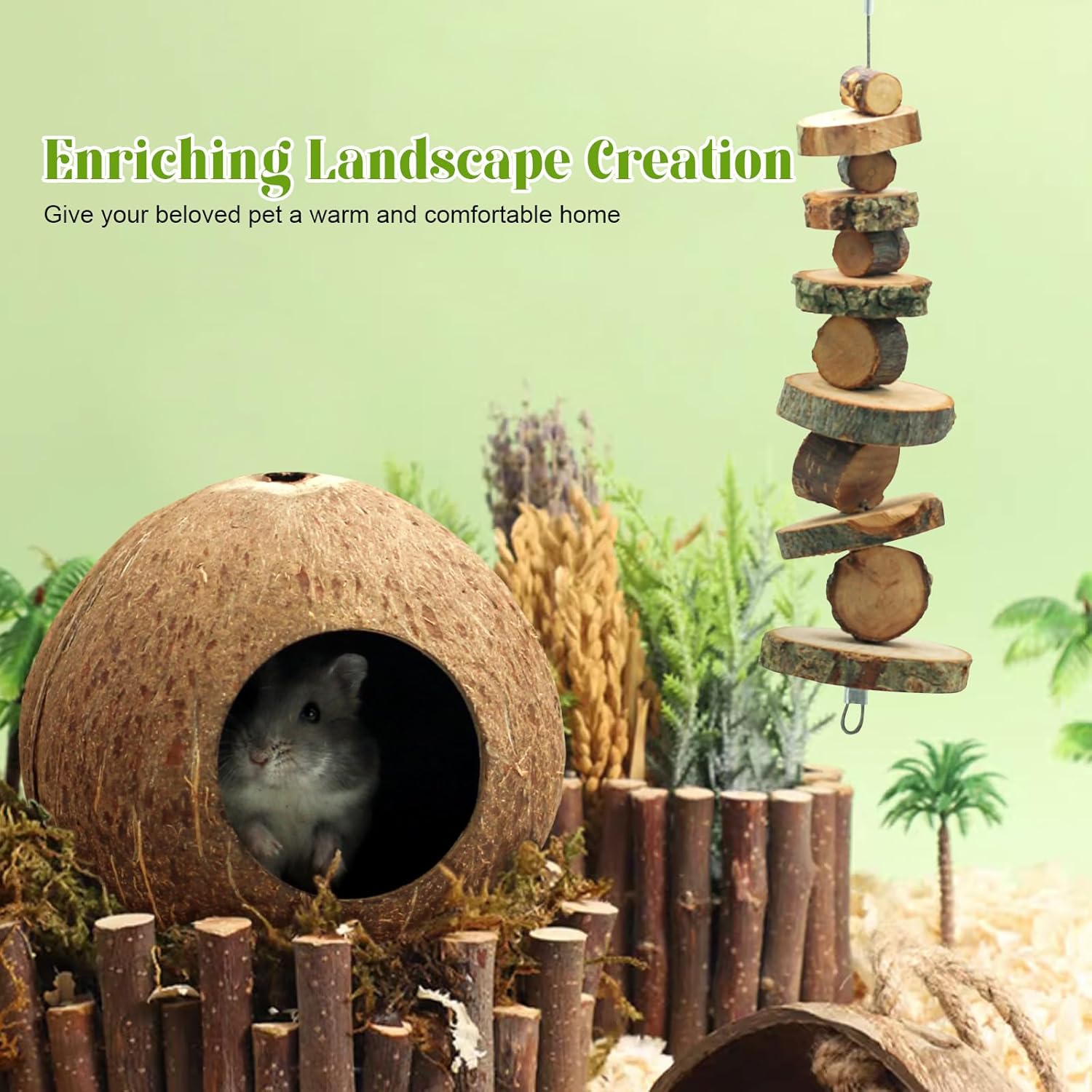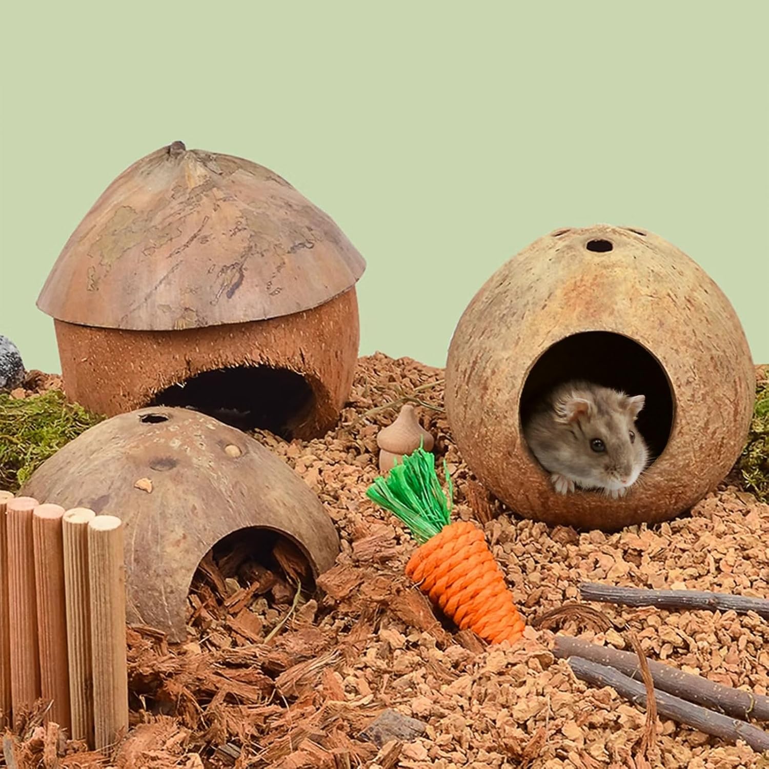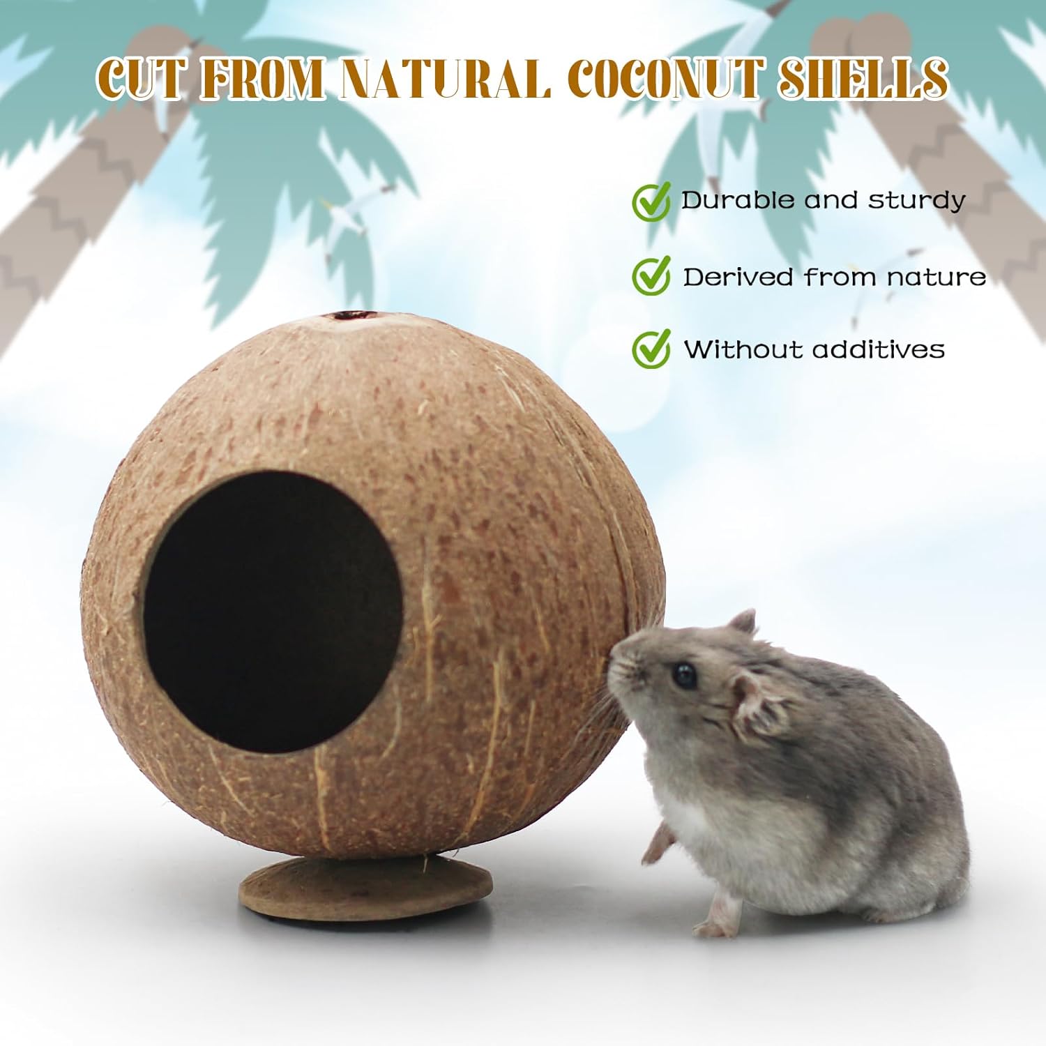 【Coconut-shaped Hamster House】Cute and unique coconut shape, providing a comfortable hiding place for your pet. It is made of coconut shells, which is very safe and environmentally friendly. The size of the coconut house is 5.3*4.72*2.2 inches, ensuring that your hamster can easily enter and exit.