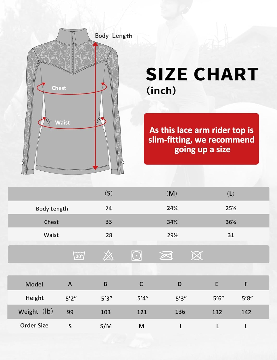 Great riding shirt for the price point. Cute details and the lace is soft, not scratchy. 4 stars because the buttons on the. Sleeve seem very loosely sewn and am concerned they’ll fall off quickly. I should not have to sew buttons on a new shirt. Also, no extra buttons provided.