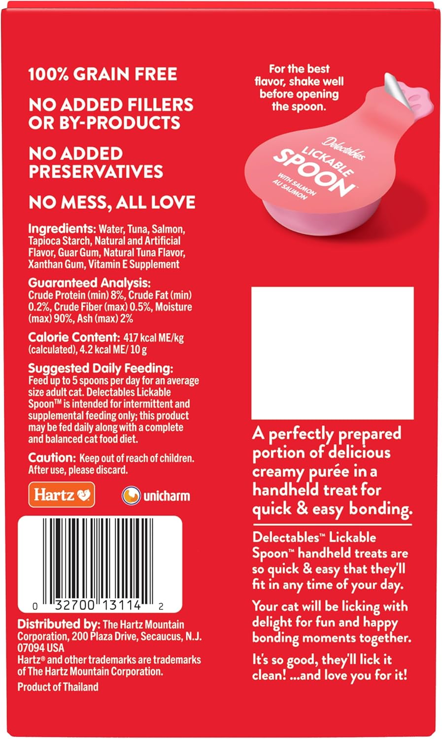 Hartz Delectables Lickable Spoon Handheld Wet Cat Treats Made with Real Salmon, Quick & Easy Creamy Puree, Mess Free, Grain-Free, No Added Fillers, No by-Products, No Added Preservatives, Salmon 32ct
