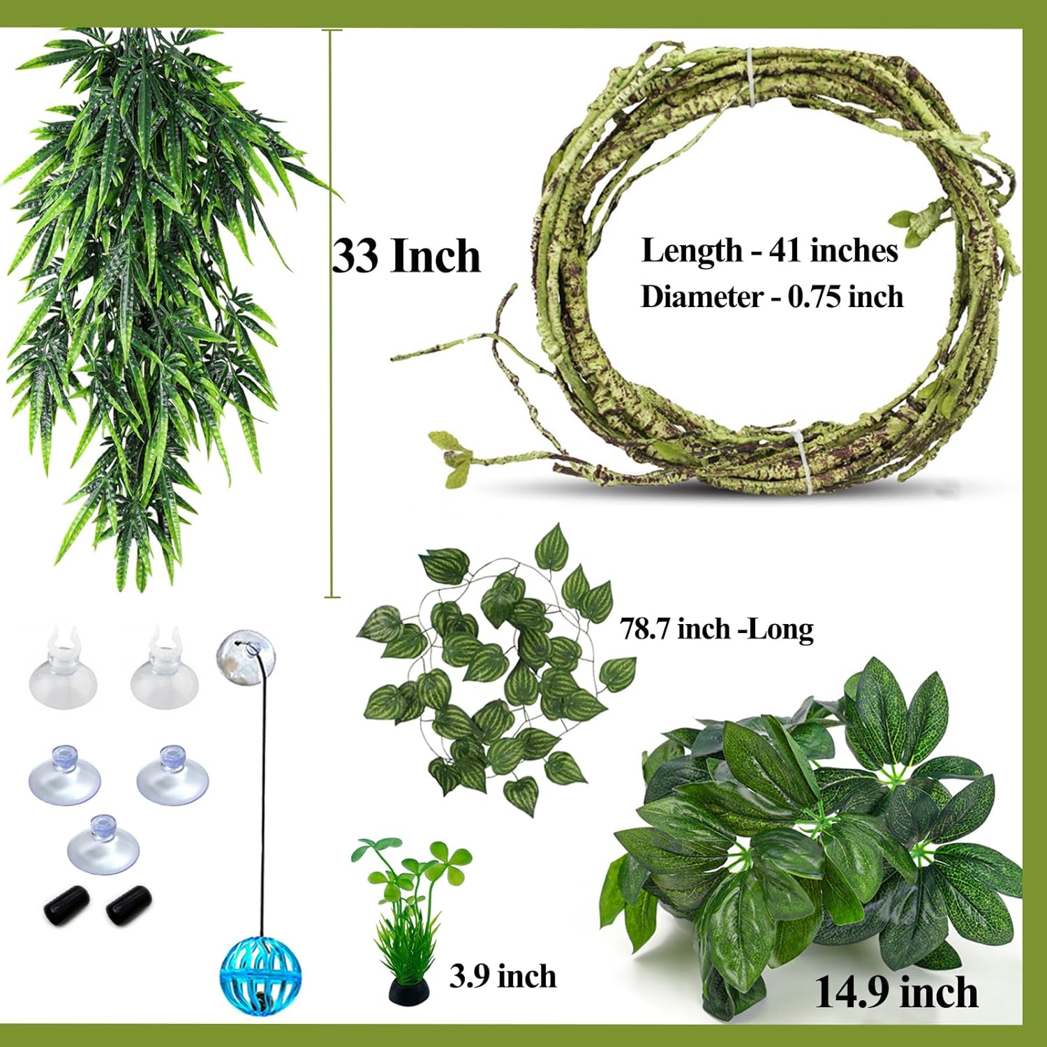 【Package Include & Dimensions】1x green vines – L x D 41 x 0.75 inch; 1x hanging plants – 33 inch; 1 x green leaves – 78inch. 1x stand plants; 1x reptile ball; 1x green plant with suction cups.