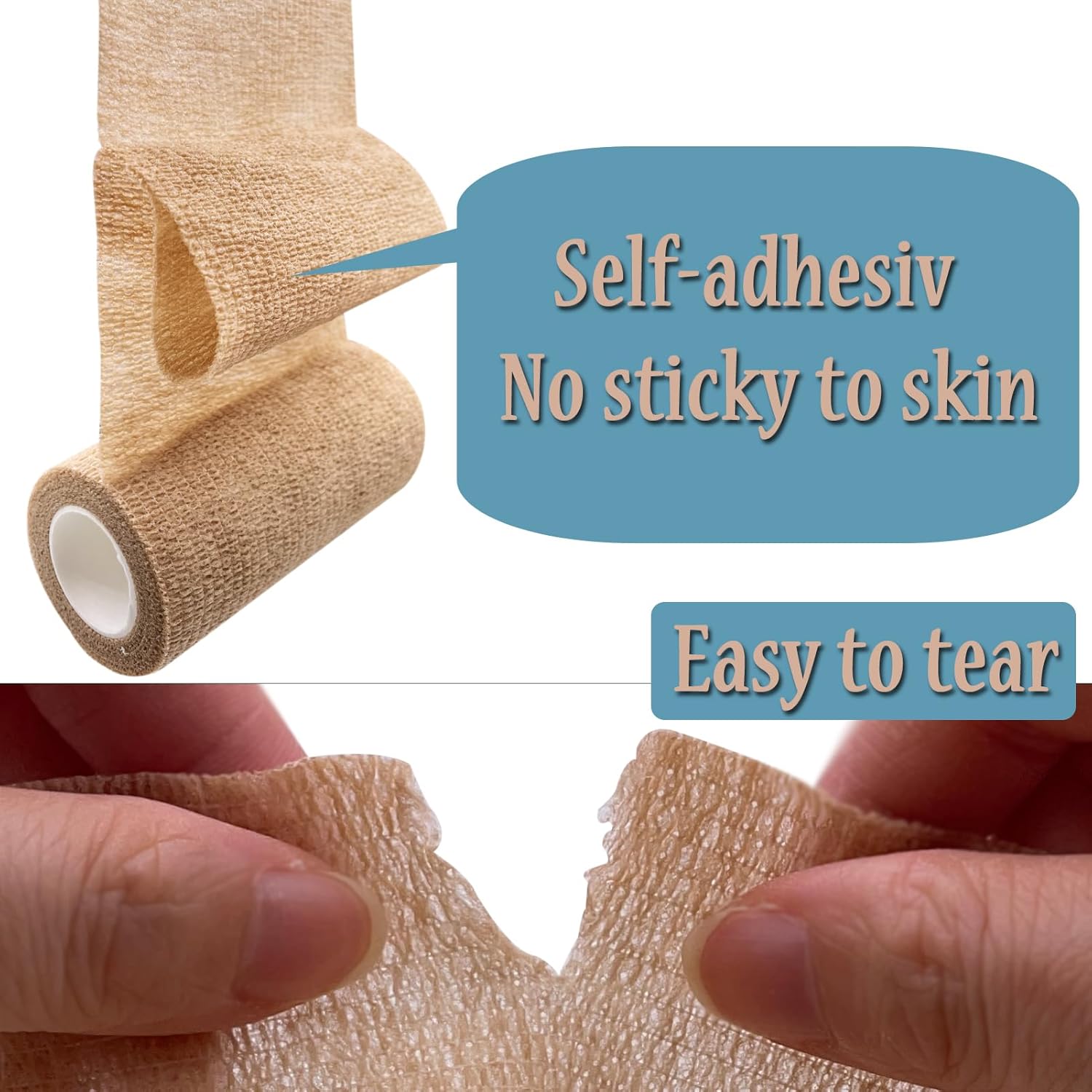 12 Rolls Bandage — Package includes 12 Rolls (4 inches X 5 yards) cohesive bandages in beige color, and each roll are individual package.