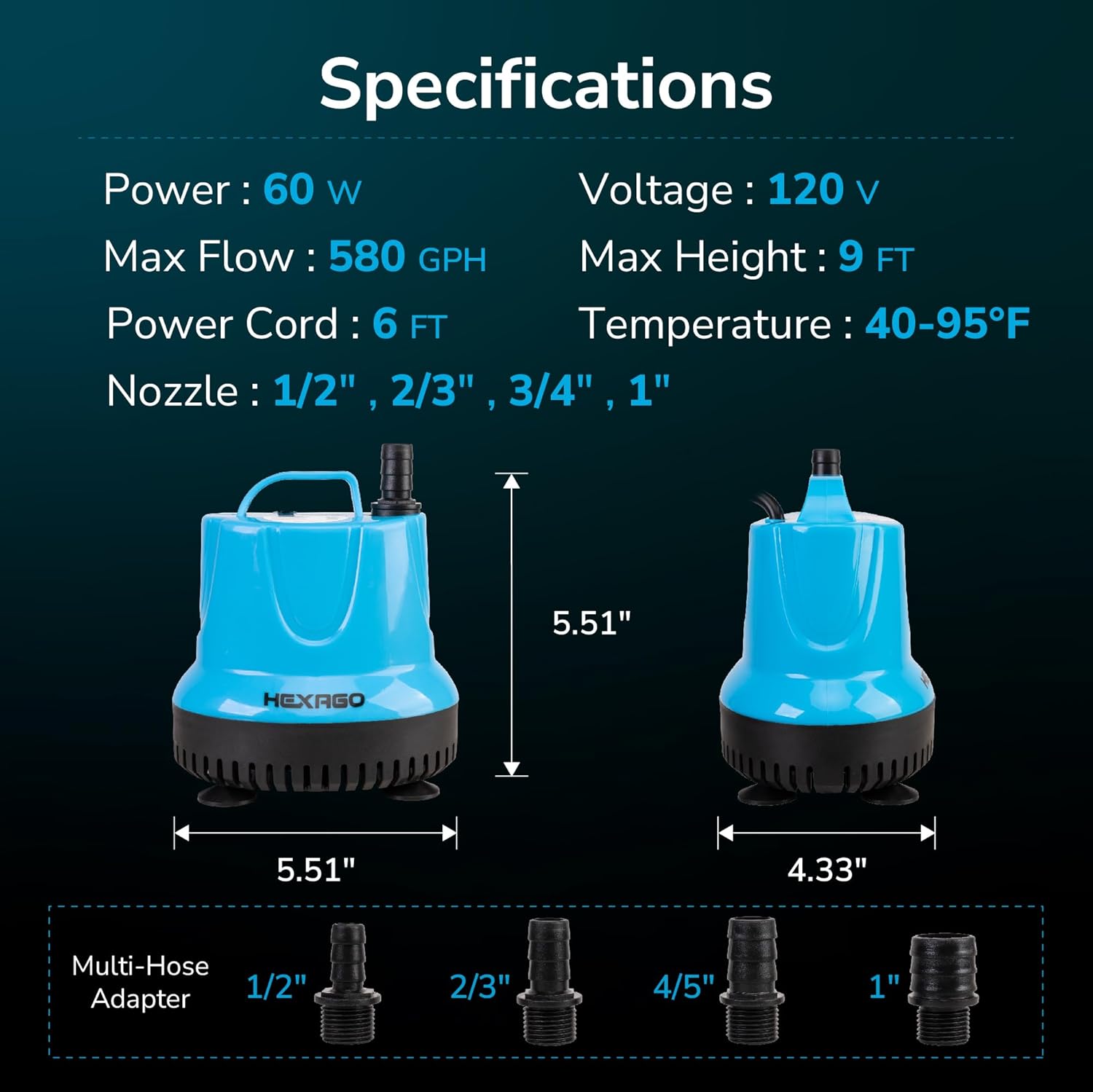 Hexago 580GPH Submersible Water Fountain Pump, 60W Small Sump Pump with 9FT High Lift, Aquarium Pumps for Outdoor Pond, Hydroponic, Statuary, Waterfall, Aquarium, Fish Tank