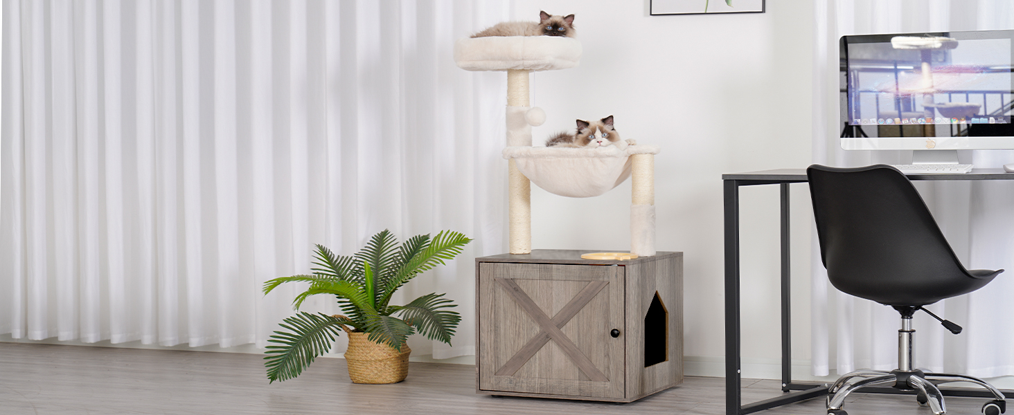 All-in-one cat tree house: It allows to keep everything about your cat in one place. Waterproof and scratch-resistant surface makes the furniture easier to clean. The cabinet can hides the cat litter box and makes the room look neater