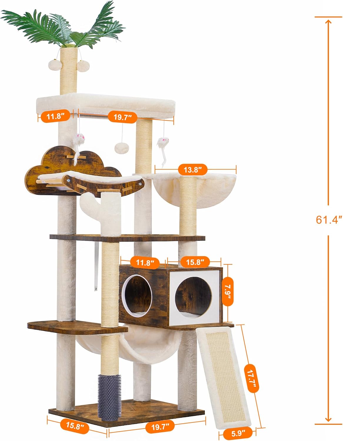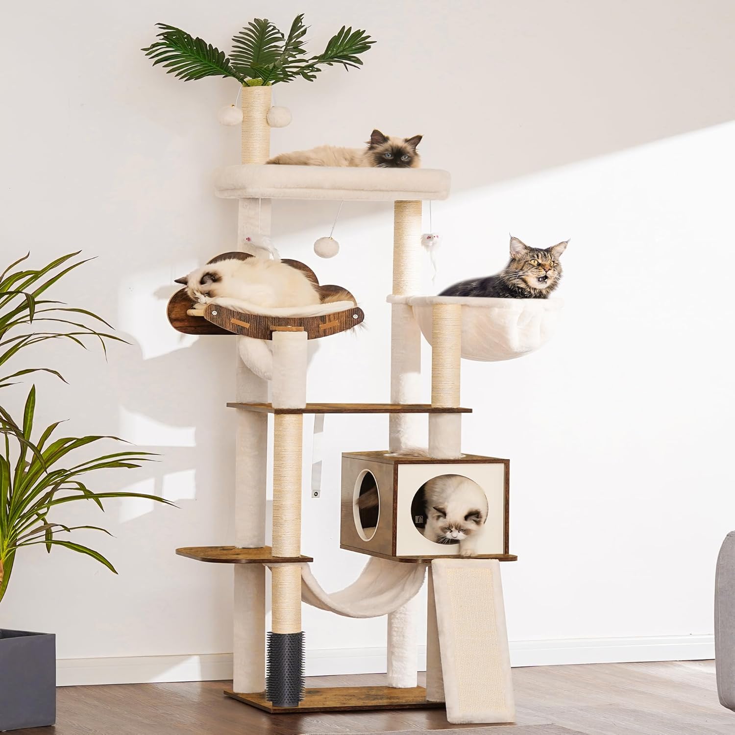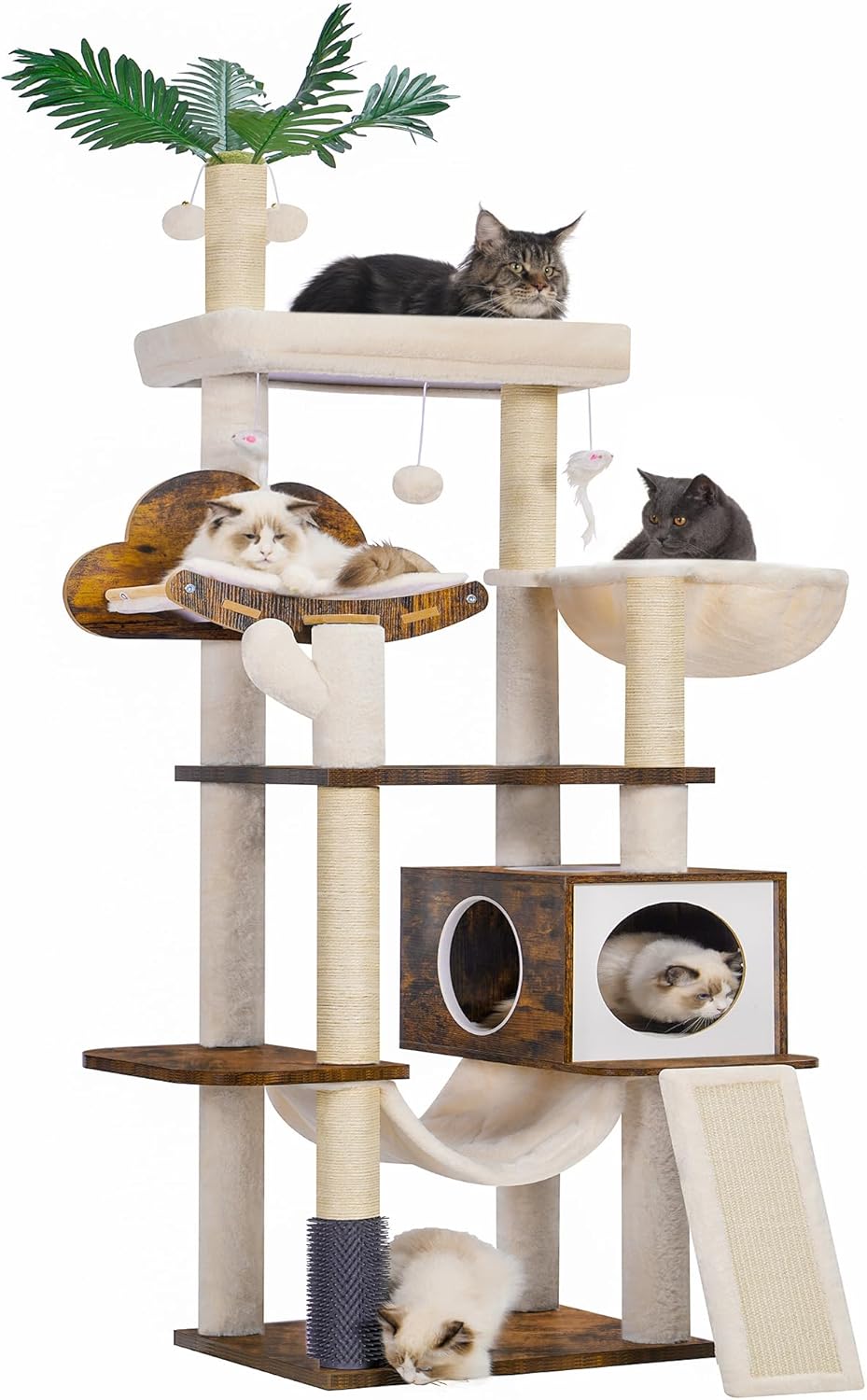 12 reviews for Heybly Wood Cat Tree for Indoor Cats, Cat Condo for Large Cats with Self Groomer, Modern Cat Scratching Tower with Basket, Hammock, Dangling Ball and Leaves, Rustic Brown HCT120SR