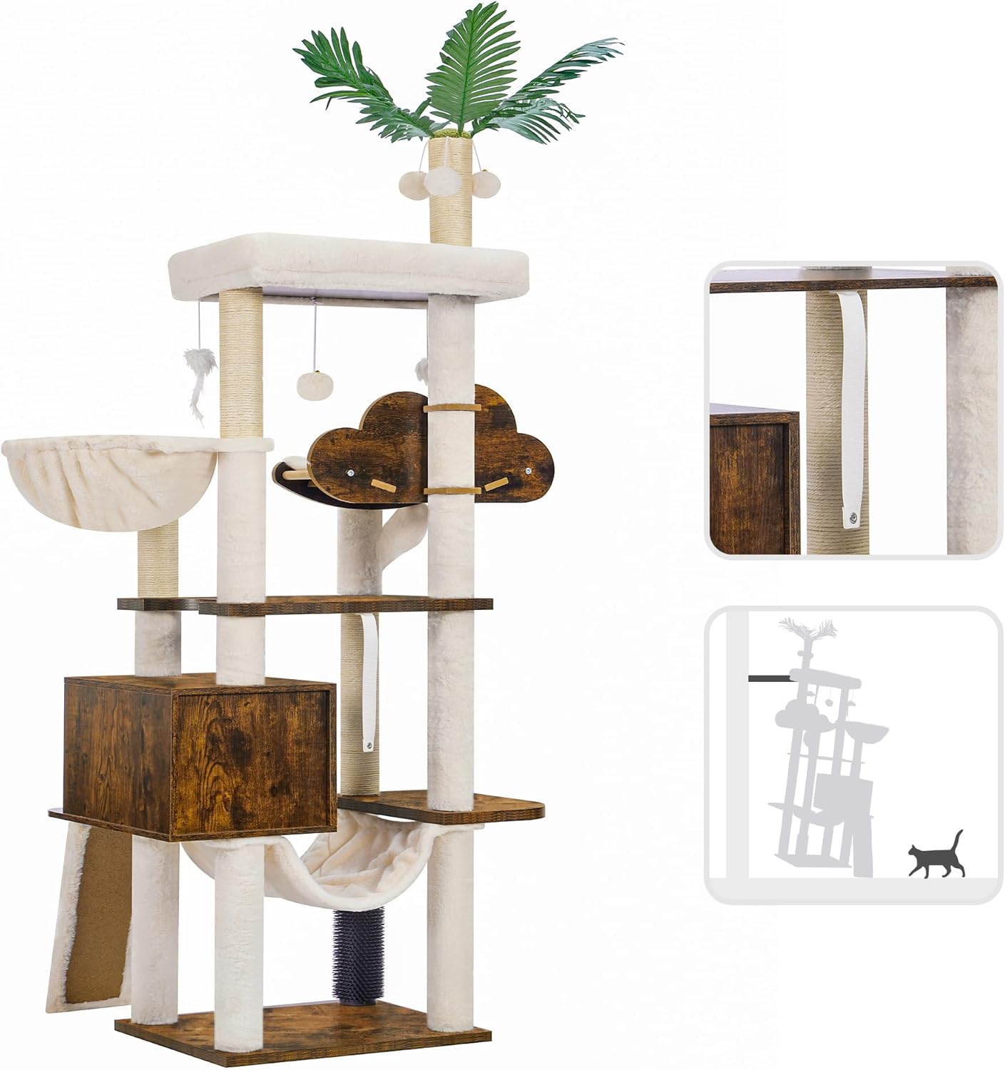 Heybly Wood Cat Tree for Indoor Cats, Cat Condo for Large Cats with Self Groomer, Modern Cat Scratching Tower with Basket, Hammock, Dangling Ball and Leaves, Rustic Brown HCT120SR