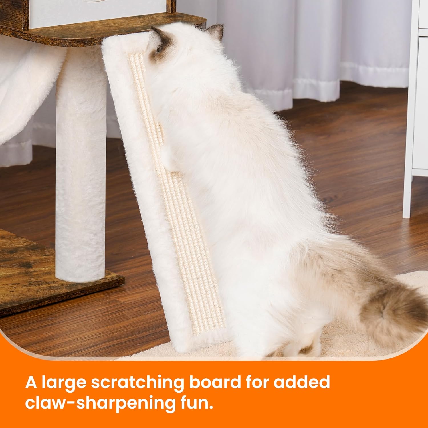 [Multi-Function Cat Play Tower]: The cat tree has sisal wrapped scratching posts with wide scratching boards at the bottom for them to sharpen their claws, and next to the scratching boards there is a cat self-groomer that provides gentle massage and brushing to help remove and collect hair, which is not only good for your cat’s health, but also creates a clean environment for you and your family
