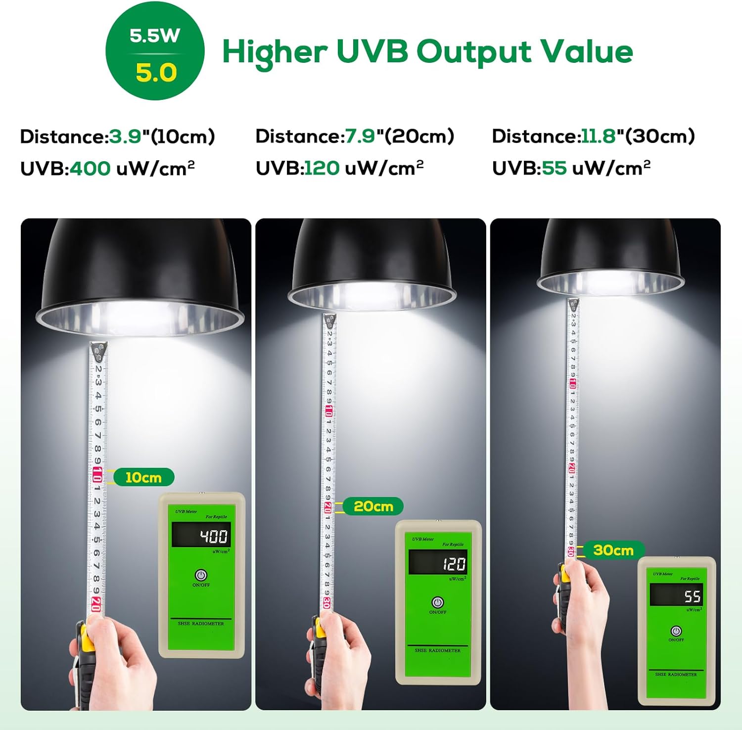 Upgraded version:Our 5.5W5.0 led UVB output decays at a slower rate than compact fluorescent lamp with use,reduce frequency of replacement.Our LED UV lights have a lifespan several times that of other products. Provide you with stable UVB/UVA output, with a lifespan of up to 1000 hours. The light is soft and not harsh, which can protect the eyes of reptiles from harm.The UVB radiation level of this product decreases by about only 18% after one year of use (3,600 hours of operation).