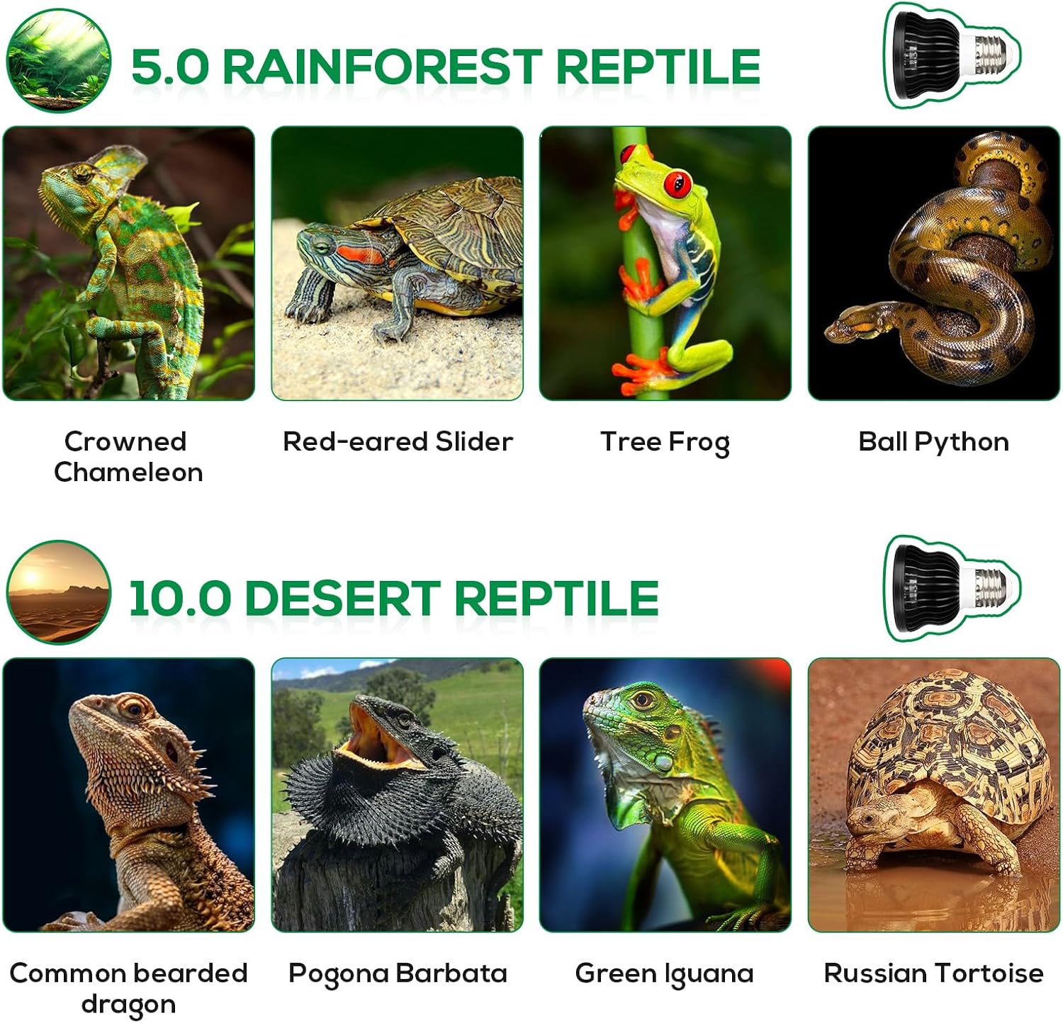 Highly efficient and Energy-saving:our UVB light for reptiles with efficient and energy-saving LED bulbs as illuminants, their luminous efficiency is 2-3 times of traditional compact fluorescent lamps.The content of UVA and UVB in the bulbs is similar to the ratio of natural sunlight. The warm white 5000K color temperature used in white beads is softer and more comfortable than the 6500K color temperature of fluorescent lamps,promoting calcium absorption and ensuring the health of reptiles.