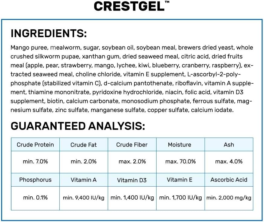 A scientifically formulated, uniquely balanced, ready-to-use paste diet. It contains all the necessary nutrients, needed vitamins, amino acids and trace minerals fruit and insect-eating geckos, like the crested gecko need to live a long and health-filled life.