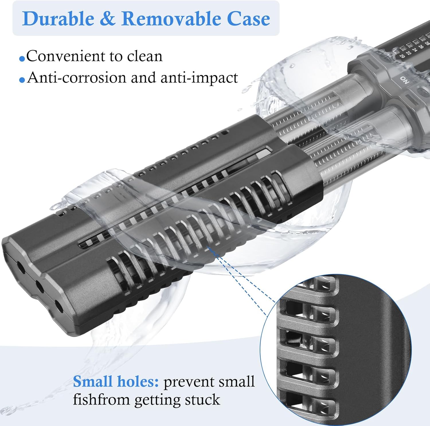 [Durable & Removable cover] – Removable design makes cleaning easy and the protective cover provides protection for the aquarium heater and your fish. Our case is corrosion and impact resistant to prolong the product life, and the small hole on it prevents small fish from getting stuck.
