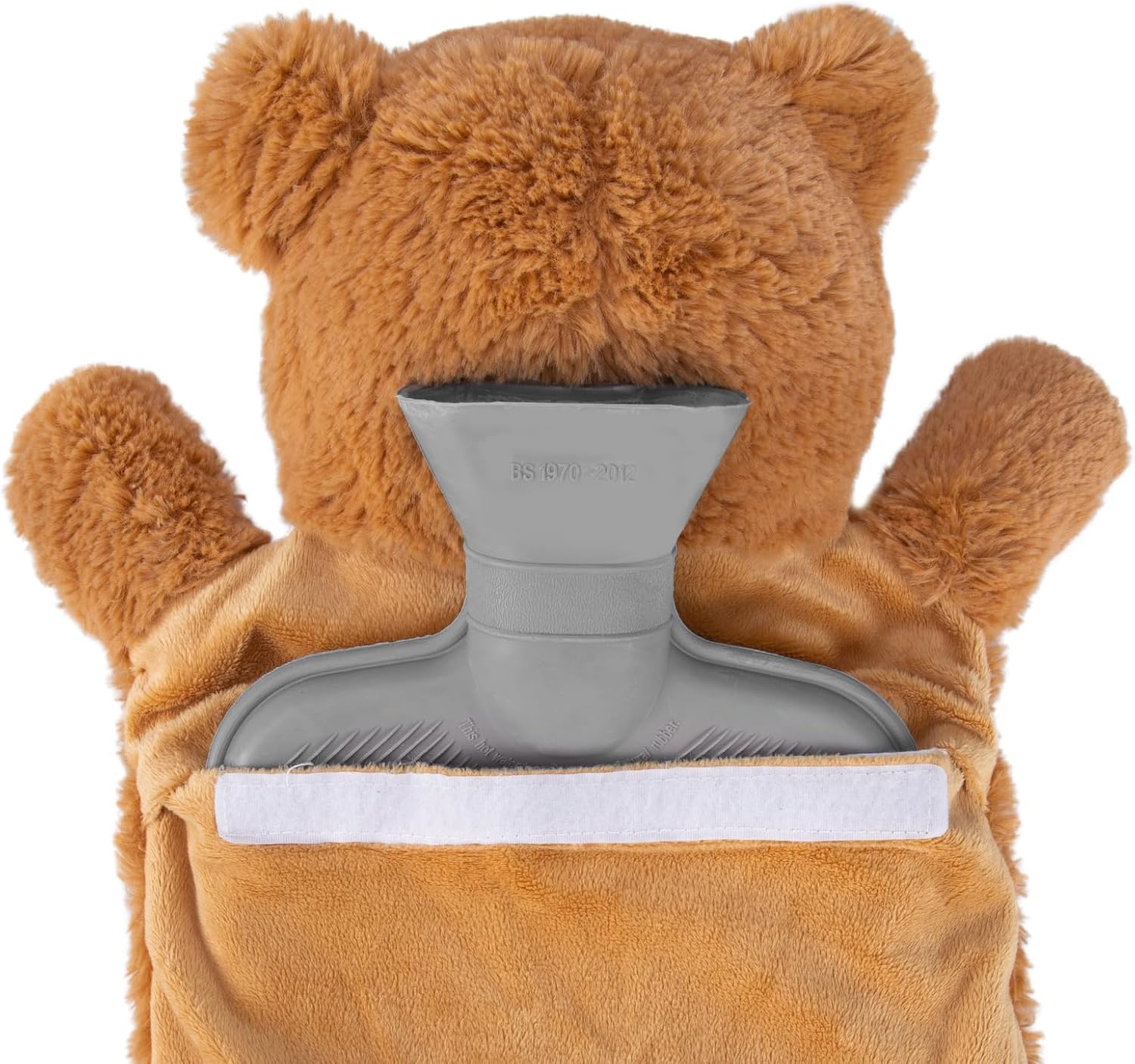 This is one of the best things I have ever bought! Both water bag and the bear are high quality. It’s cuter than the pictures shown in Amazon! The warm water lasts for half a day! It’s soft and cozy.I was wondering if the bear is big enough to fit the whole water bag. However there is a hole in the bear’s neck so it fits perfectly!The only thing I don’t like is the velcro is too strong. However it is good to treat everything gently to extend the life of everything.