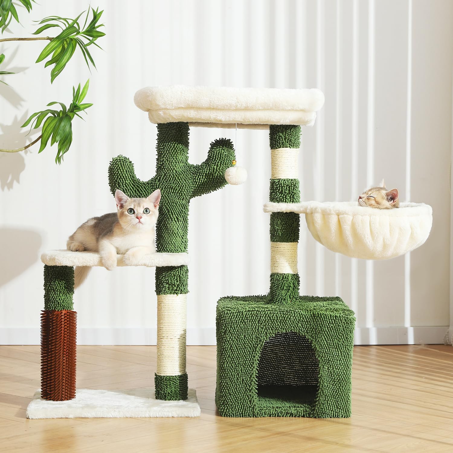 The cactus design is adorable and looks so cute in my living room. Assembly was quick and easy, and the whole structure feels stable and well-made despite its compact size. It’s ideal for kittens or adult cats and doesn’t take up too much space. She also goes crazy for the hanging ball toy—it keeps her entertained for hours. The cozy condo is my cat’s new favorite nap spot.