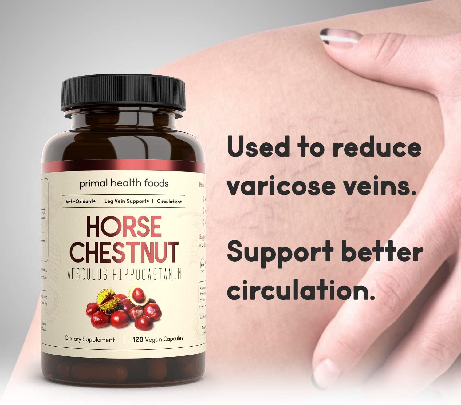 HISTORAL USE: Horse Chestnut has been used to help reduce visibility of varicose veins and promote blood flow. Horse Chestnut contains aescin, a compound traditionally used to improve blood circulation and reduce swelling in the legs caused by varicose veins.