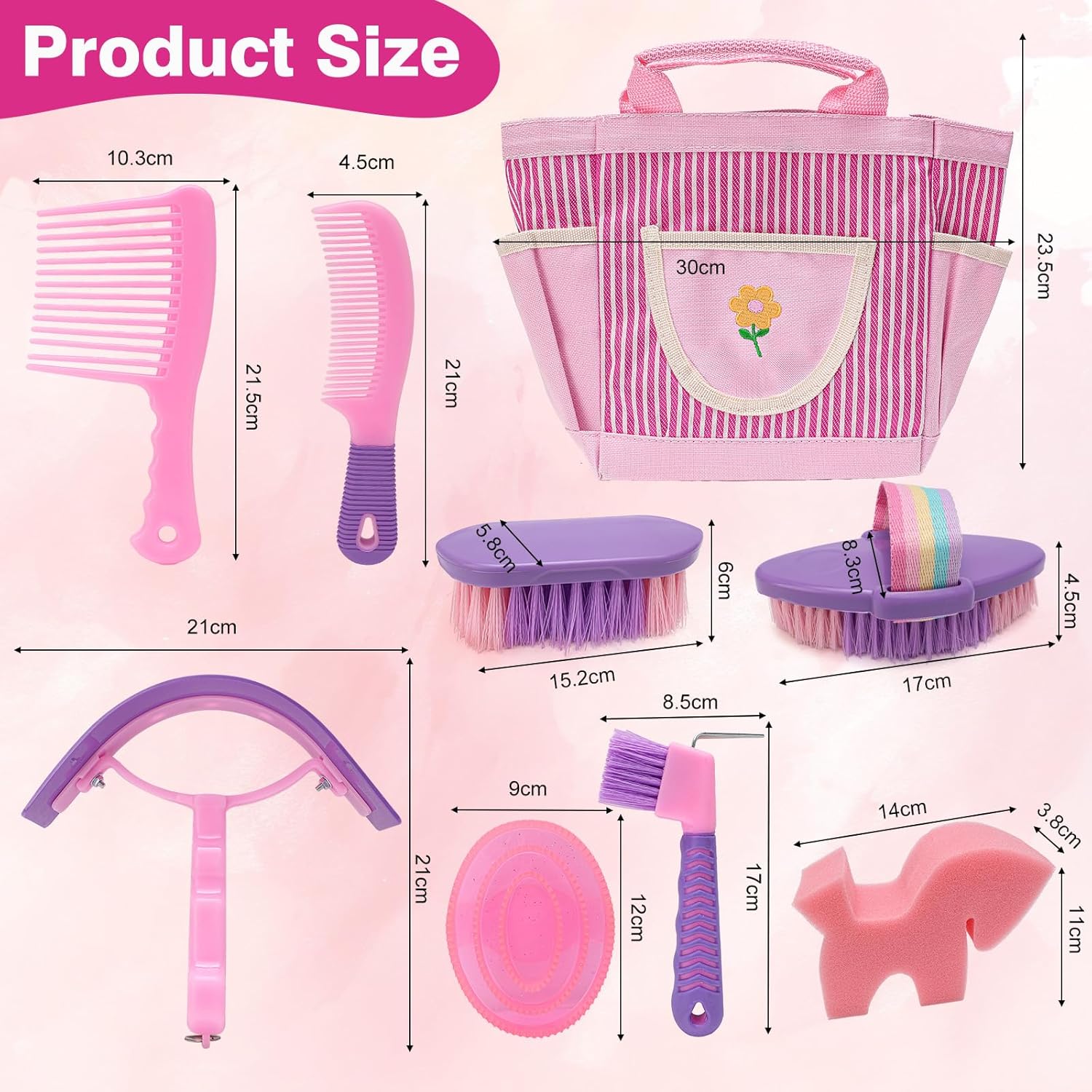 9 Piece Set Horse Grooming Tools:The Horse Grooming Kit is a comprehensive set of 8 pcs tools and a store pink bag for horse owners who value quality and efficacy in their grooming routine. Designed for both seasoned riders and beginners alike, this kit offers everything you need for thorough and effective grooming sessions