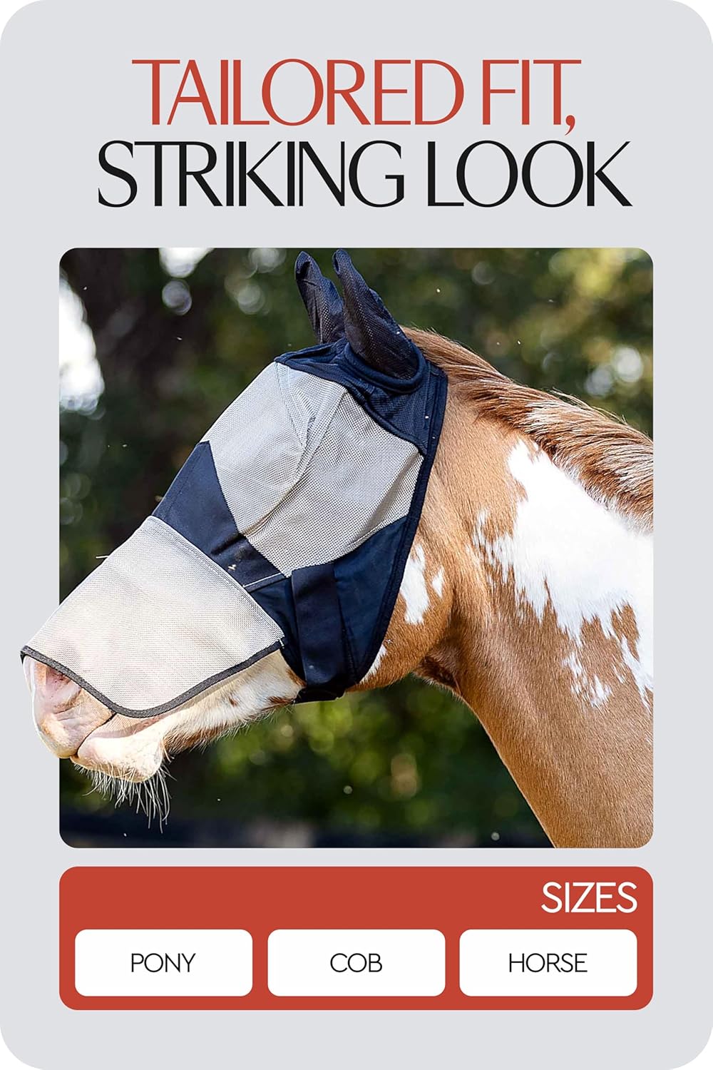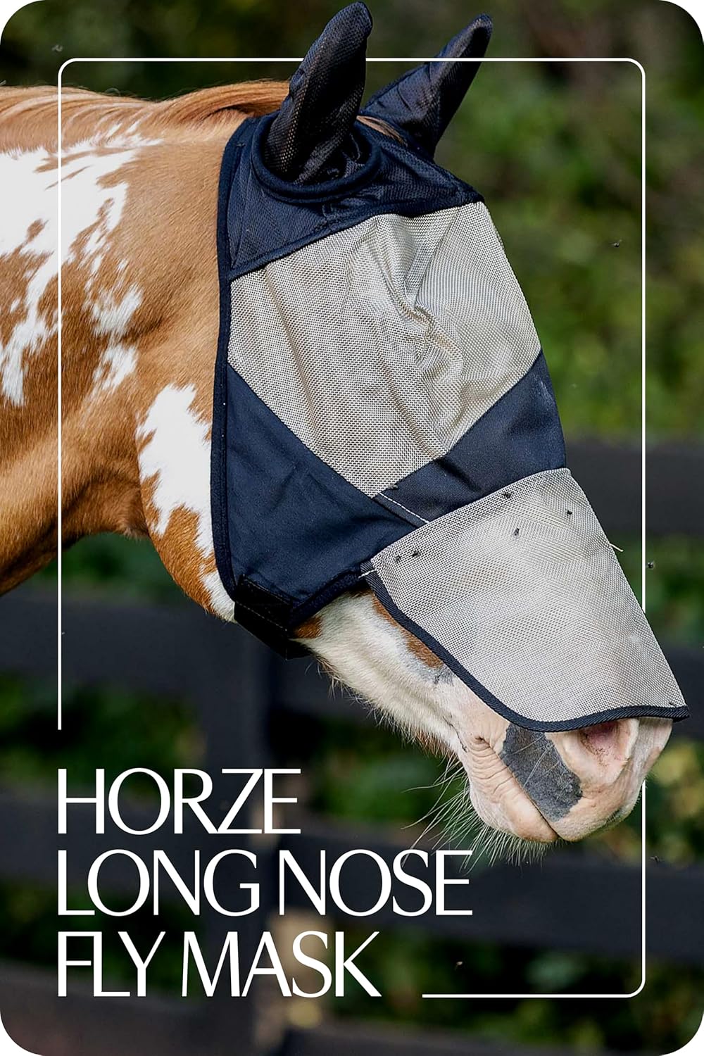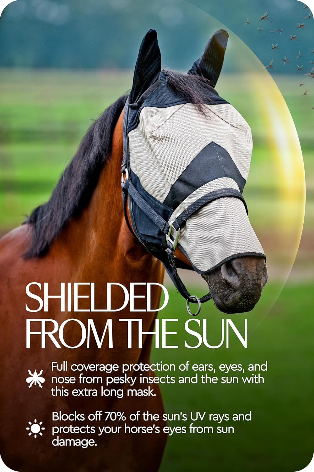 HORZE Horse Fly Mask with Long Nose Cover and Ears | Full Coverage UV Protection – Durable, Soft Micro Mesh Design