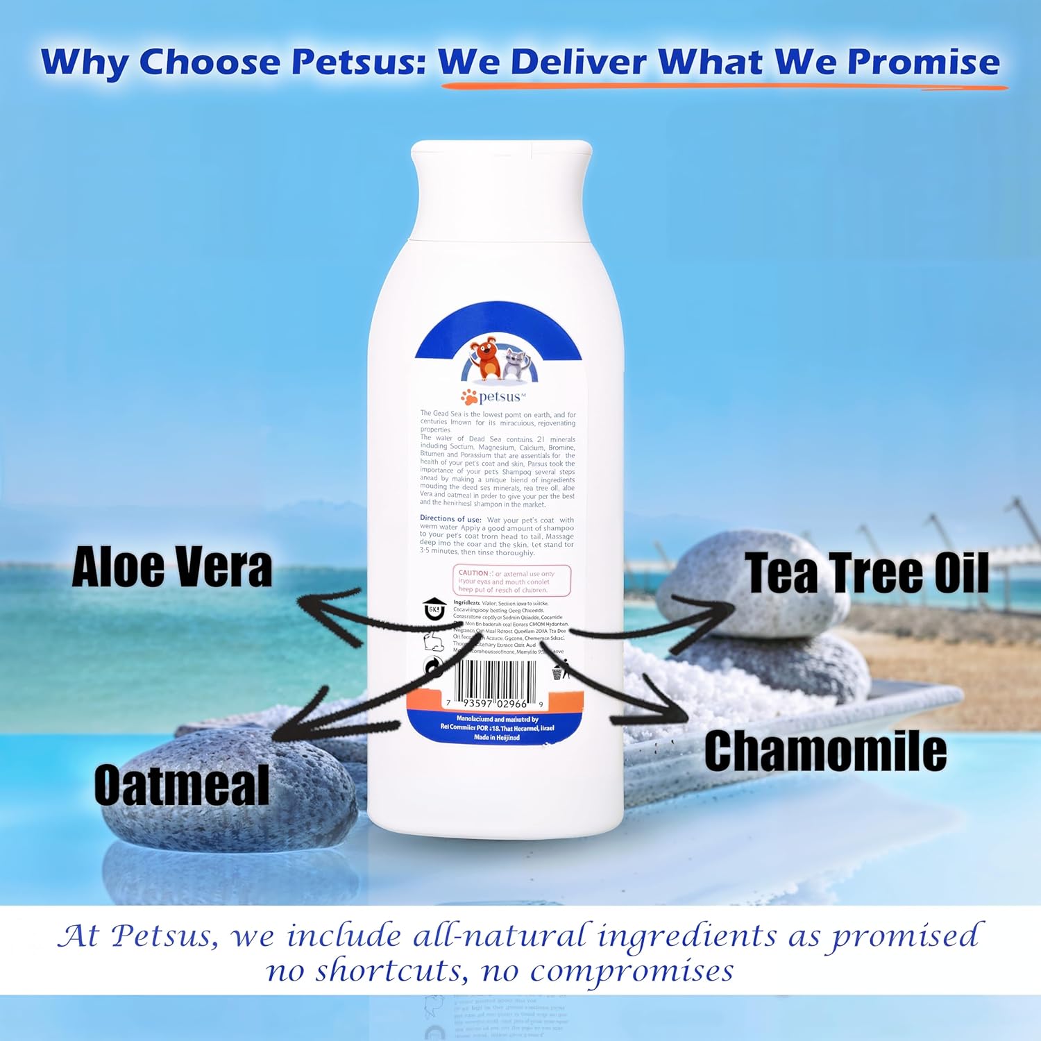 I am so impressed with the Petsus Dead Sea Minerals Shampoo! Iâve tried many shampoos for my two cats, but this one stands out as the best by far. Both of my fur babies have sensitive, itchy skin, and finding a product that doesnât irritate them has been a challengeâuntil now.The natural ingredients in this shampoo, like aloe vera, oatmeal, and tea tree oil, are a game changer. Their coats felt so soft and luxurious after the bath, and the itching has noticeably reduced. I also appreciate that itâs free from parabens, alcohol, and artificial colorsâthis gives me peace of mind knowing Iâm using something safe and gentle on their delicate skin.Bonus: The scent is mild and pleasant, not overwhelming like some pet shampoos. Bath time used to be a dreaded chore, but with this shampoo, itâs turned into a bonding moment with my cats. Highly recommend this for anyone with pets who have sensitive skin or who want to keep their fur looking and feeling amazing!