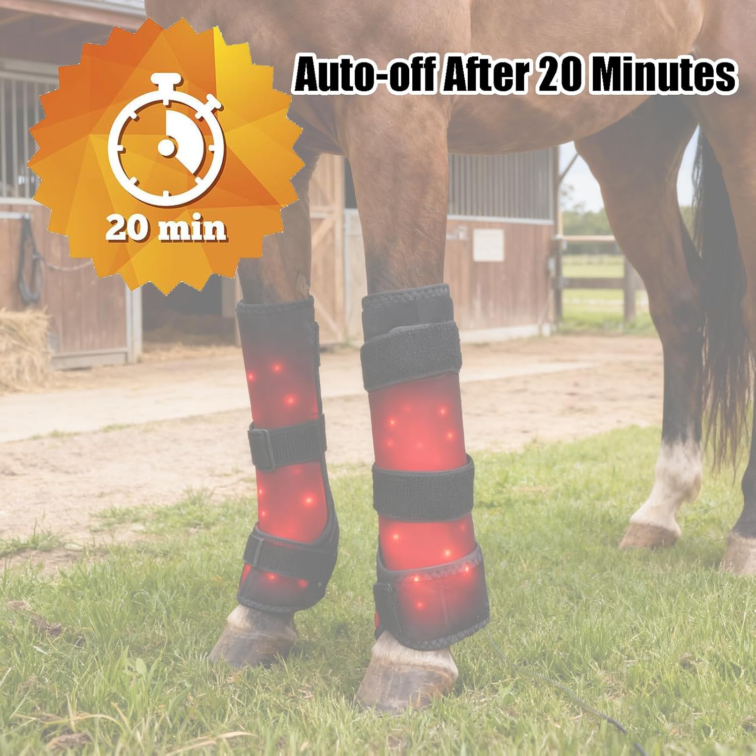 I have a very large baby who is half draft and he is a year and a half old. I thought this would be perfect for trying on his growing bones because I read about all of the benefits of red light therapy to help promote bone growth.The directions are pretty straightforward. You turn it on and then thereâs three different settings and it has an automatic 15 minute timer.I charged it up before bringing it out to the barn and I was able to do all four legs on one charge.I didnât have time to do my other two horses, however, I also plan to use it on them because we all know the stress that the bones in horses feet endure.My yearly at first was kind of unsure on the back legs and wanted to get it off, but it stayed on see my video that I am attaching of where he tries to get it off. And after a little bit, he relaxed and he was a lot better on his front legs and then I did his final behind leg.Well, there isnât a super ton of guaranteed research in red light therapy for humans, it has been proven to be really beneficial for animals.So Iâm excited to do this maybe once a week with my horses and just see how it helps them stay strong.Overall, I would recommend this product. It works well it wrapped around my horse. It stayed on his legs when he tried to kick it off and it charged well and it lasted the entire session.I think my only small complaint would be that I wish the lights on. It were a little brighter because I did this during the day and it was a little hard to see what setting it was on when my yearling started to kick his leg after putting it on. However, I was outside in the sunlight, and my horse was not standing still so that complaint falls more on me than the actual product. If I was in a barn, it would be a lot easier to see the light not being in direct sunlight.So I might be using this more in the evenings and not the afternoon since my horses are outside.
