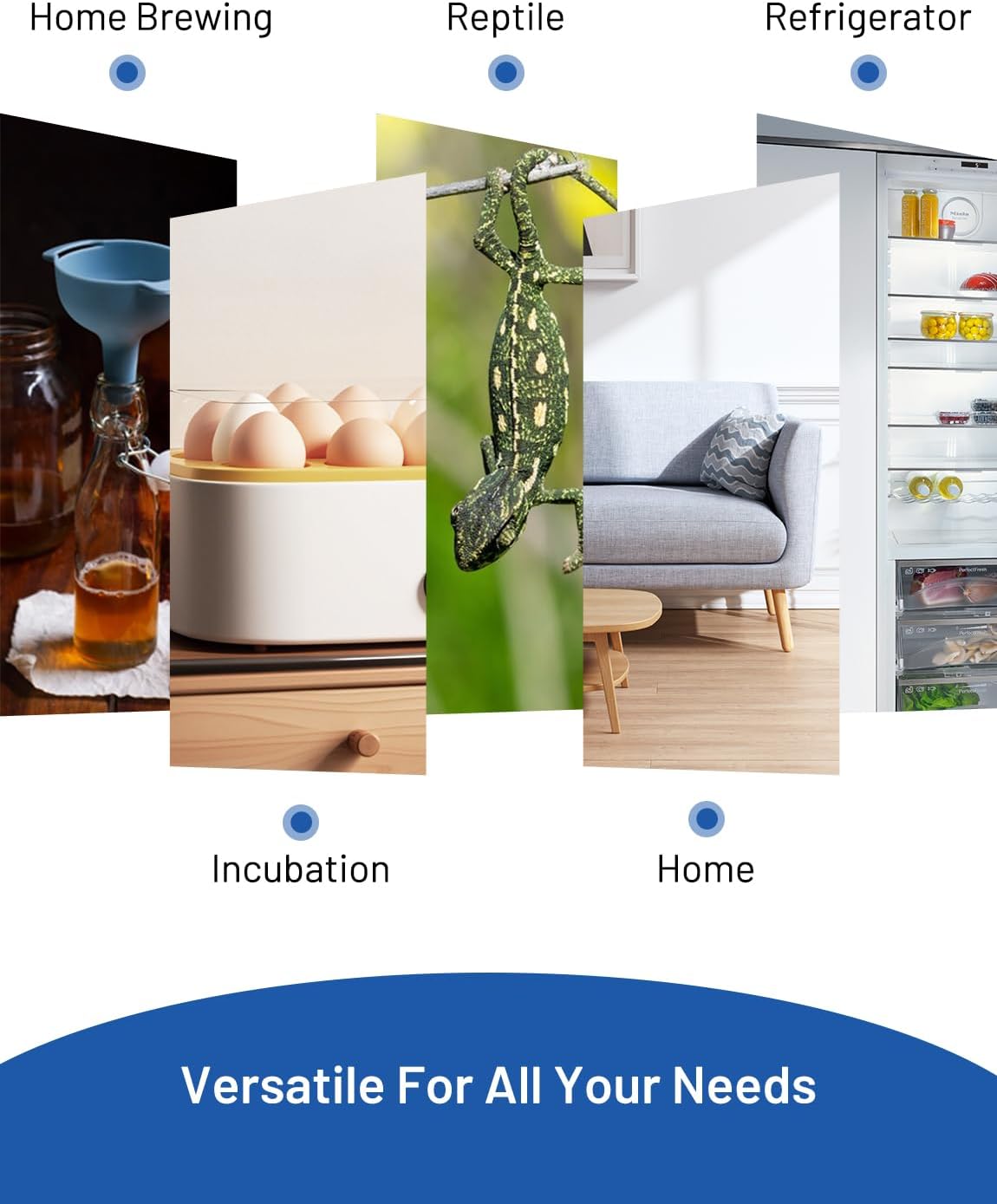 【Heating or Cooling Modes】Switch seamlessly between heating or cooling control based on your preset start/stop temperatures, ideal for maintaining ideal climates in reptile terrariums, greenhouses, or home brewing setups while saving energy bills