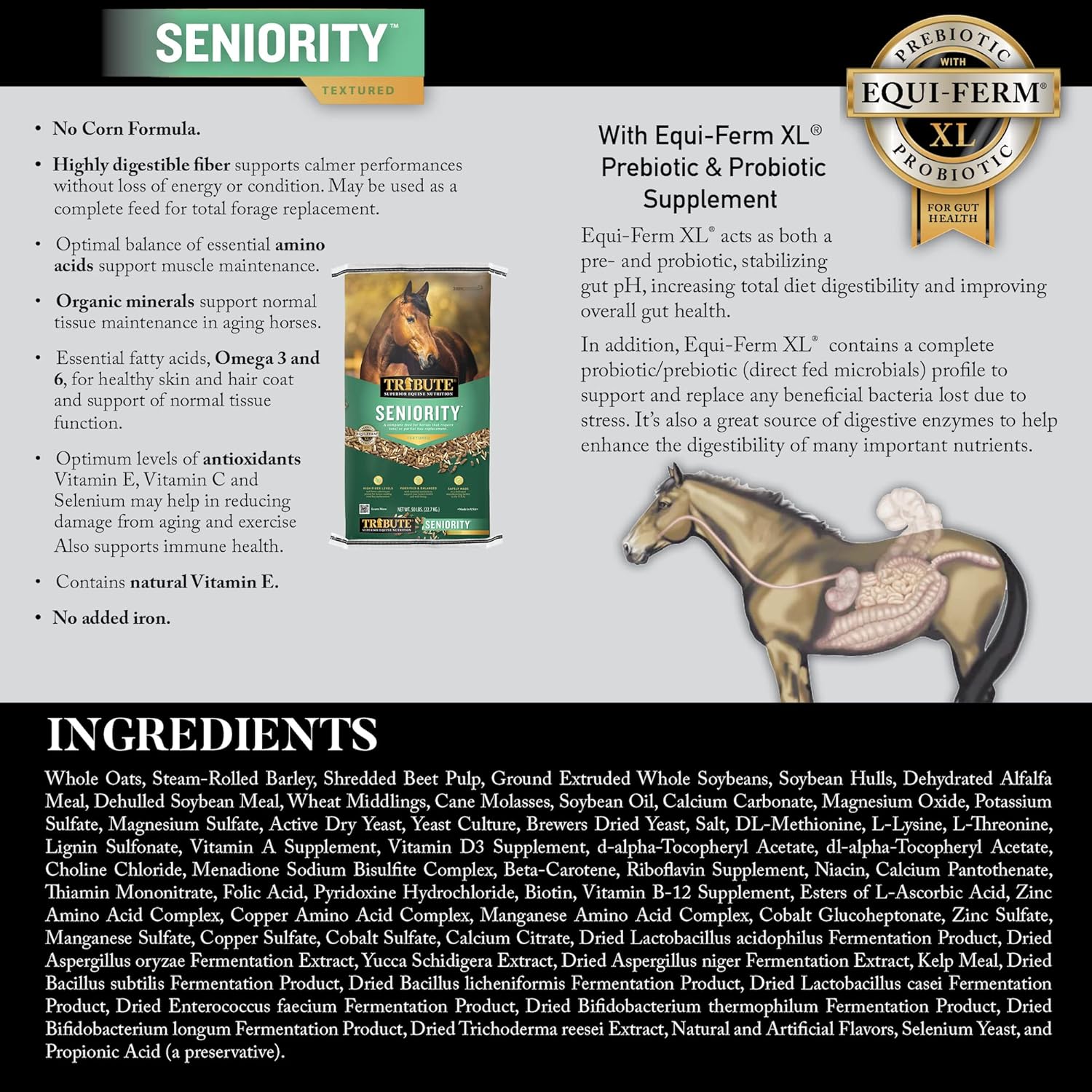 With EquiFerm XL microencapsulated active dry yeast; acts as both a pre- and probiotic, increases total diet digestibility and improves overall gut health