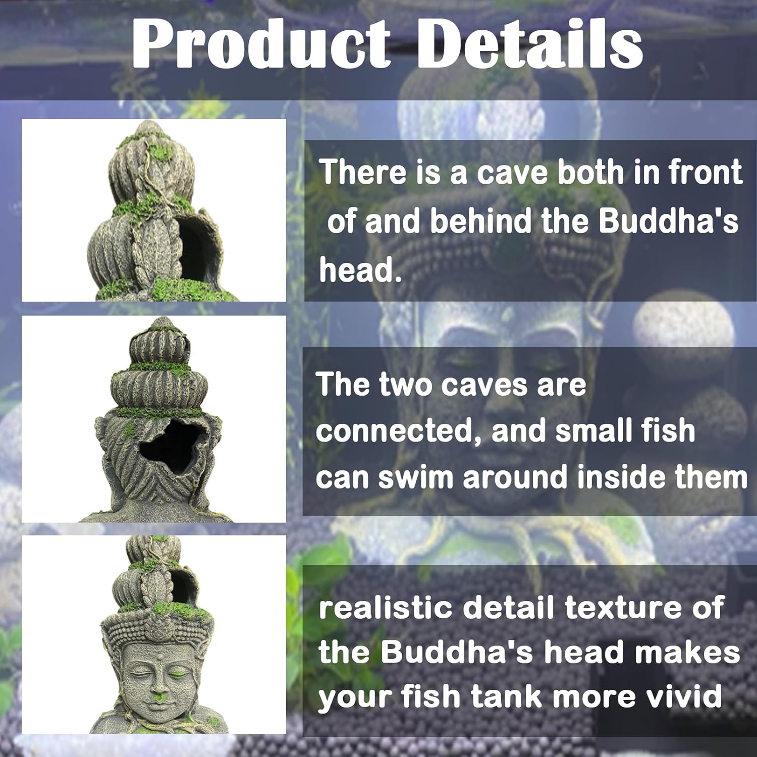 【Fish Tank Unique】Aquarium buddha statue decorations is realistic workmanship.Make it look vivid underwater.There are two holes on the back and front of the fish tank buddha statue ornament,Your fish can swim,play,hide in the aquarium buddha decor.buddha statue aquarium provides a great hiding spot for your fish and makes your fish tank unique.